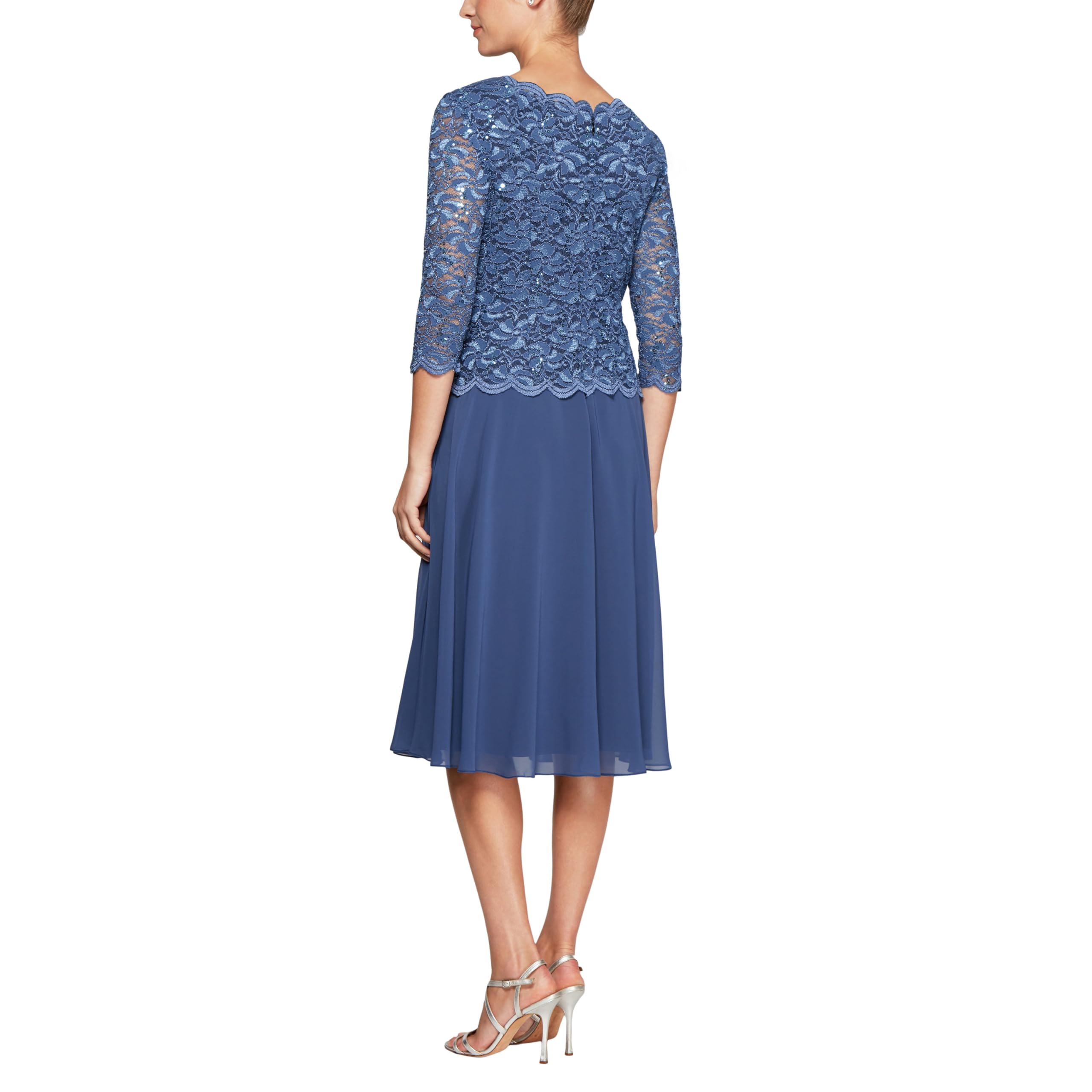 PRODUCT FEATURES: This tea-length dress features 3/4 illusion sleeves for modest coverage. Bodice crafted from embroidered lace adorned with sequins for a refined look, paired with a full flowing skirt that enhances your silhouette with every step.
