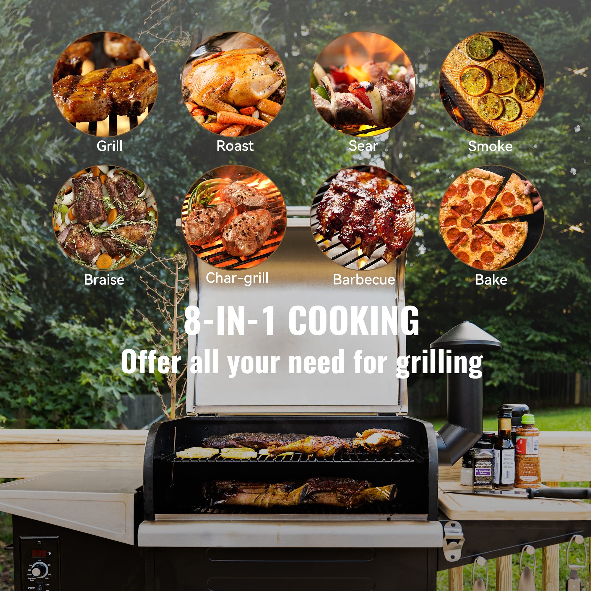 8-IN-1 VERSATILITY -- Grill, smoke, bake, roast, braise, sear, char-grill, barbecue. Using 100% natural hardwood pellets that infuse with wood-fired flavor.