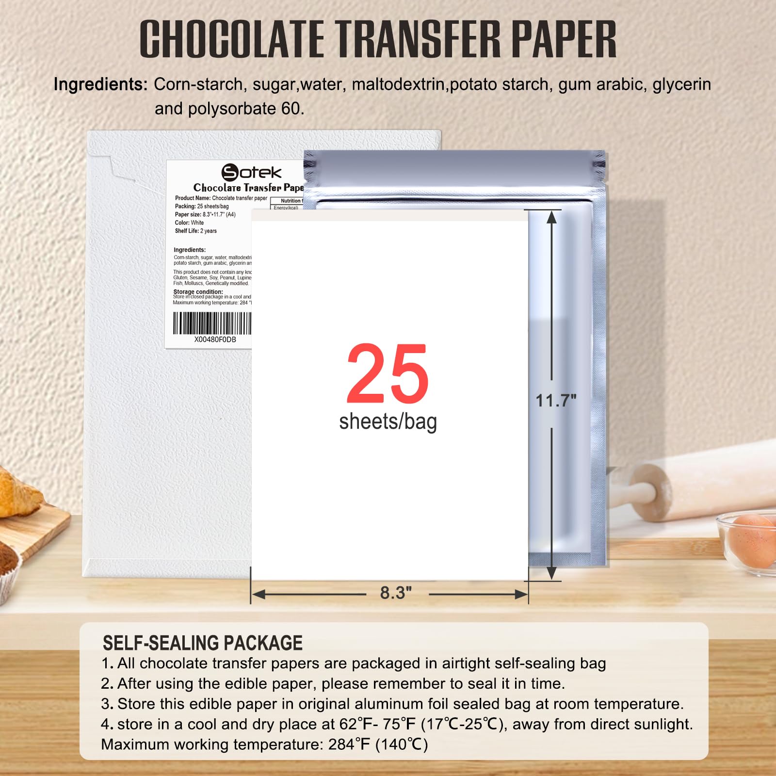 Long-Lasting: These chocolate transfer papers are packaged in airtight self-sealing bag to maintain freshness and availability for up to 2 years. After using the edible paper, please remember to seal it in time. Store in closed package in a cool and dry place at 62- 75"F (17-25°C), Maximum working temperature: 284F (140 °C)