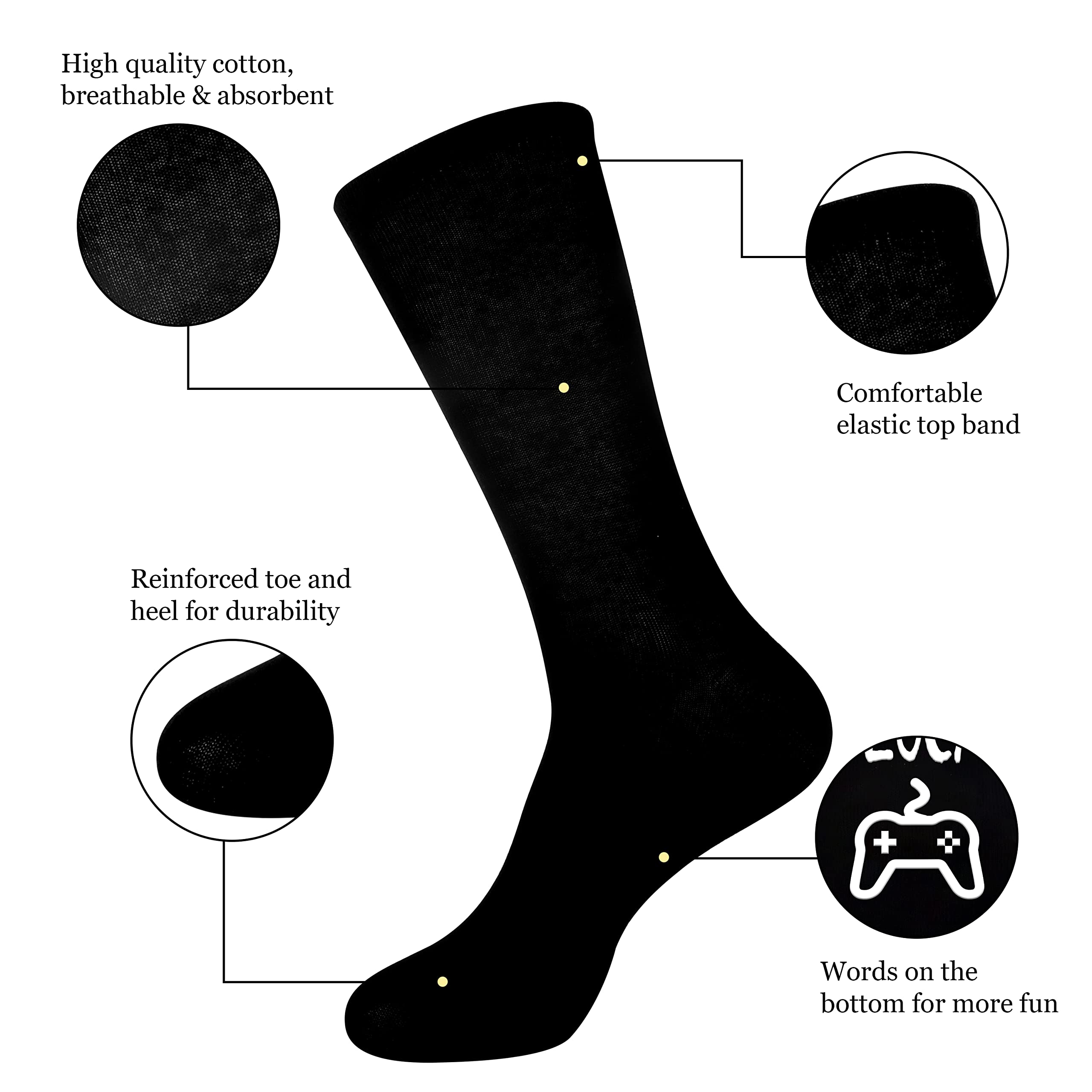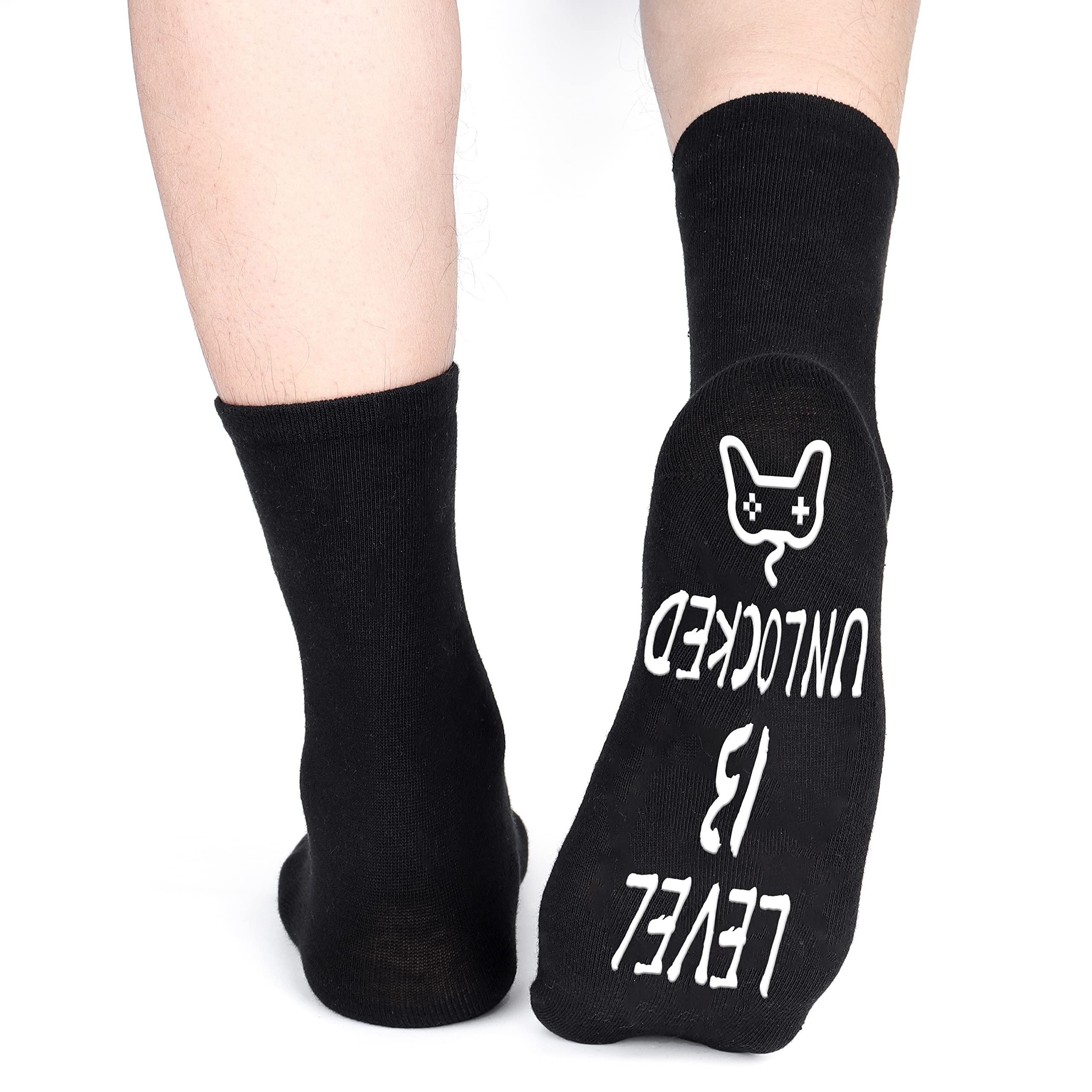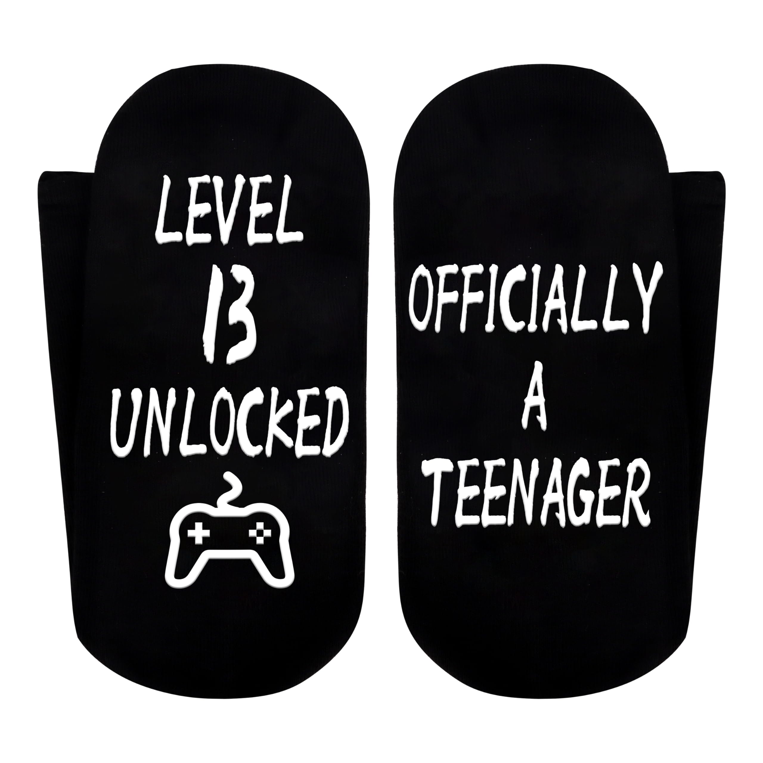 Funny Design: 2 Pairs of boy socks, black and grey, designed with different funny words “LEVEL 13 UNLOCKED, OFFICIALLY AN TEENAGER.”, “DO NOT APPROACH, WARNING NEW TEENAGER” . The fun socks must be very good gamer gifts for teen boys age 13.