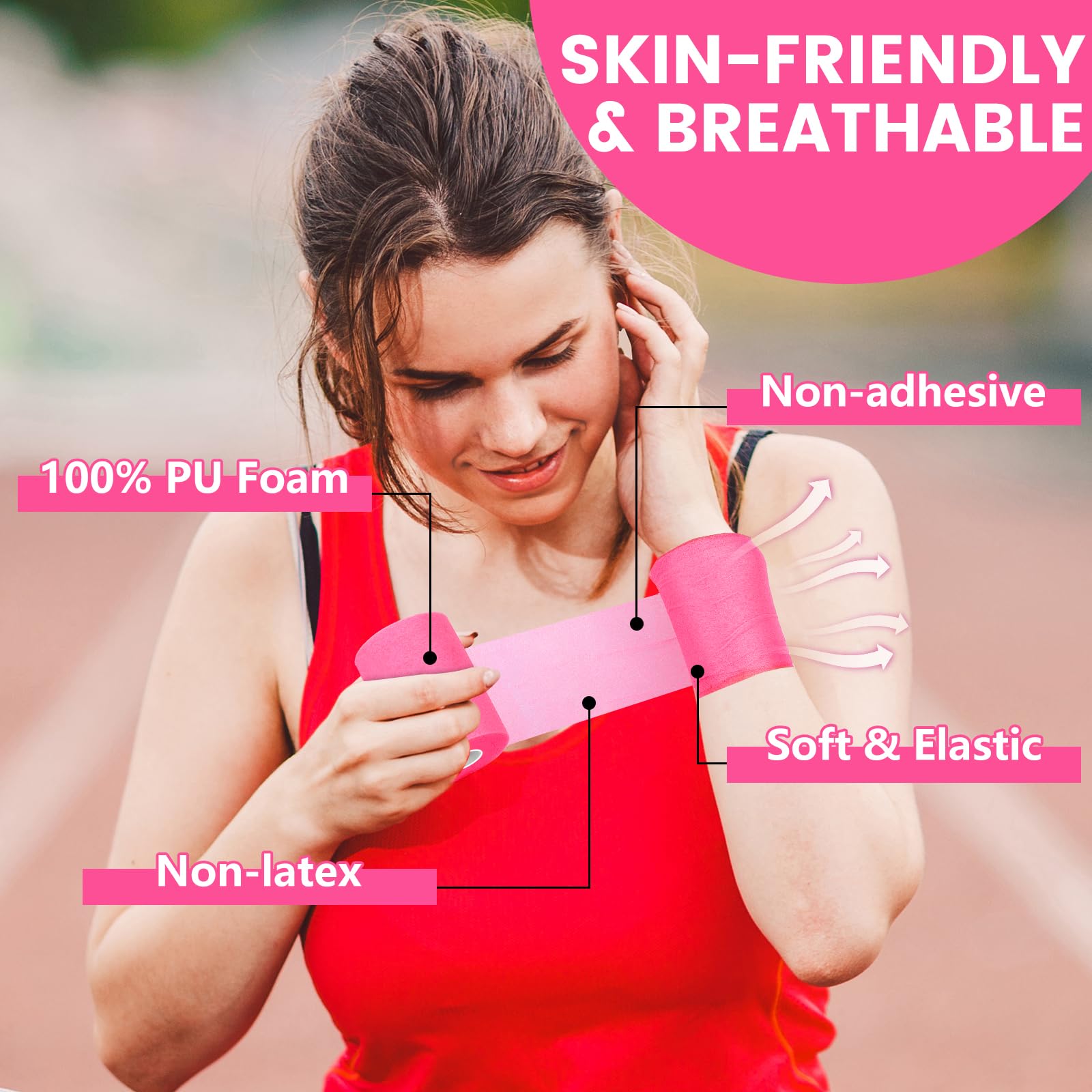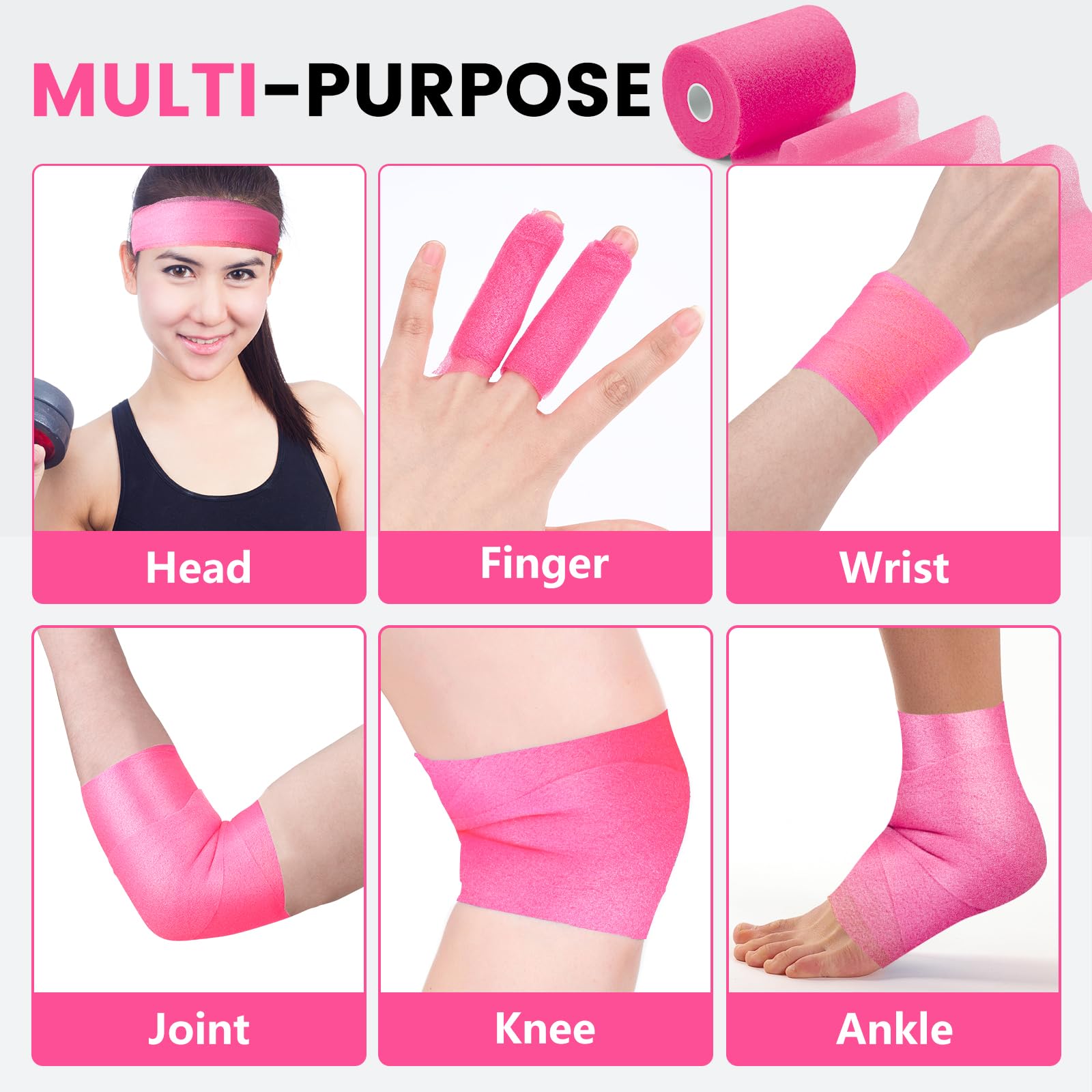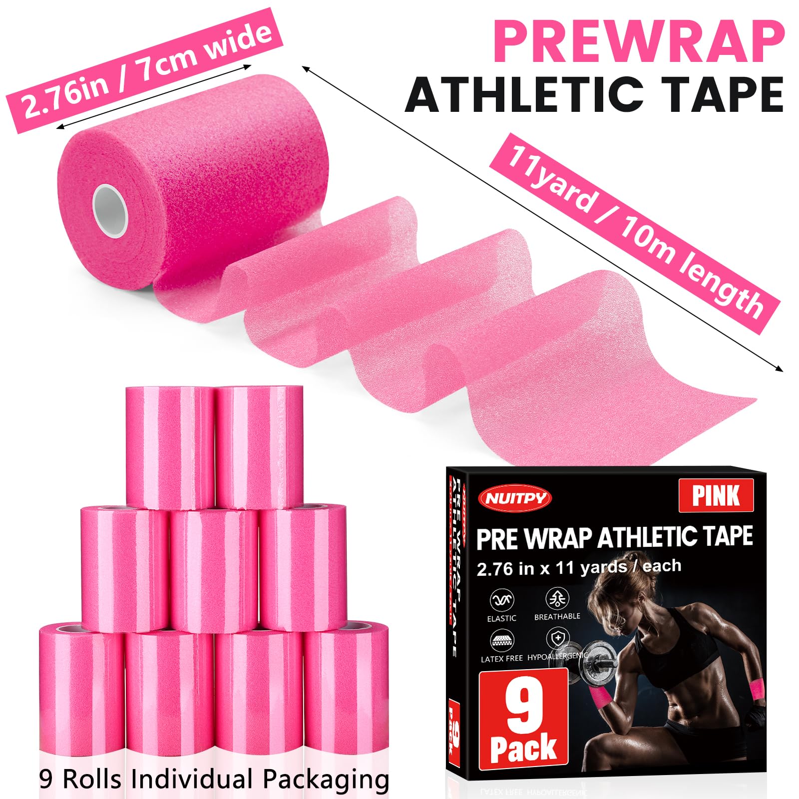 【9 Rolls Pre Wrap Tape】Package includes 9 rolls pink pre wrap tape. Each prewrap athletic tape is 2.76 inches wide and 11 yards long, Each roll is made of PU foam and no adhesive included