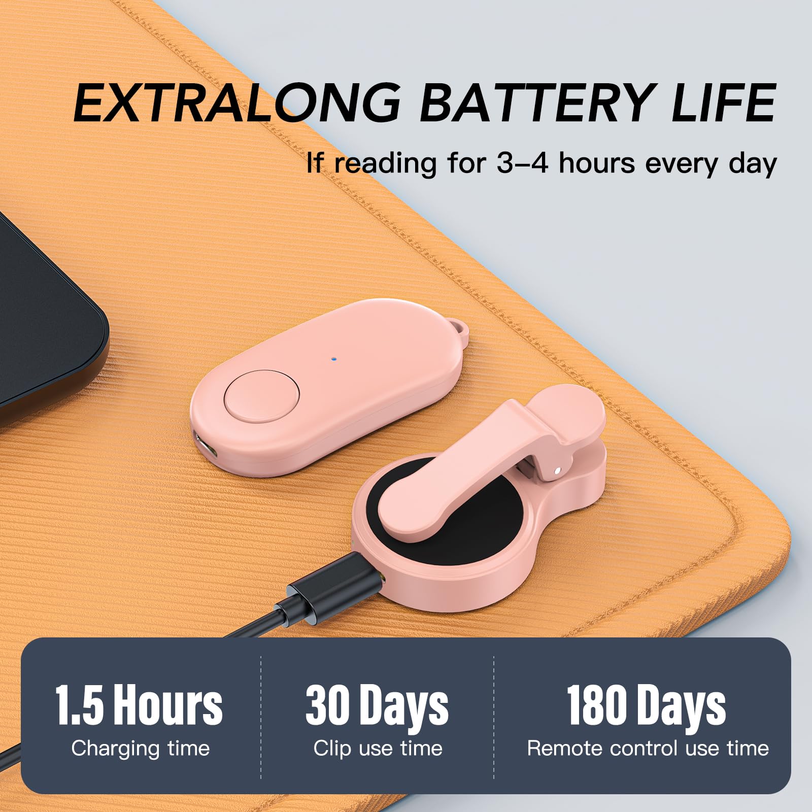 Long Battery Life: Page turner remote for Kindle has a long battery life for long hours of reading. It takes only 1.5 hours to fully charge. After fully charged,if reading 3 hours each day clip charge one time,can use 80 days and standby for up to 5 months, no need to worry about frequent charging