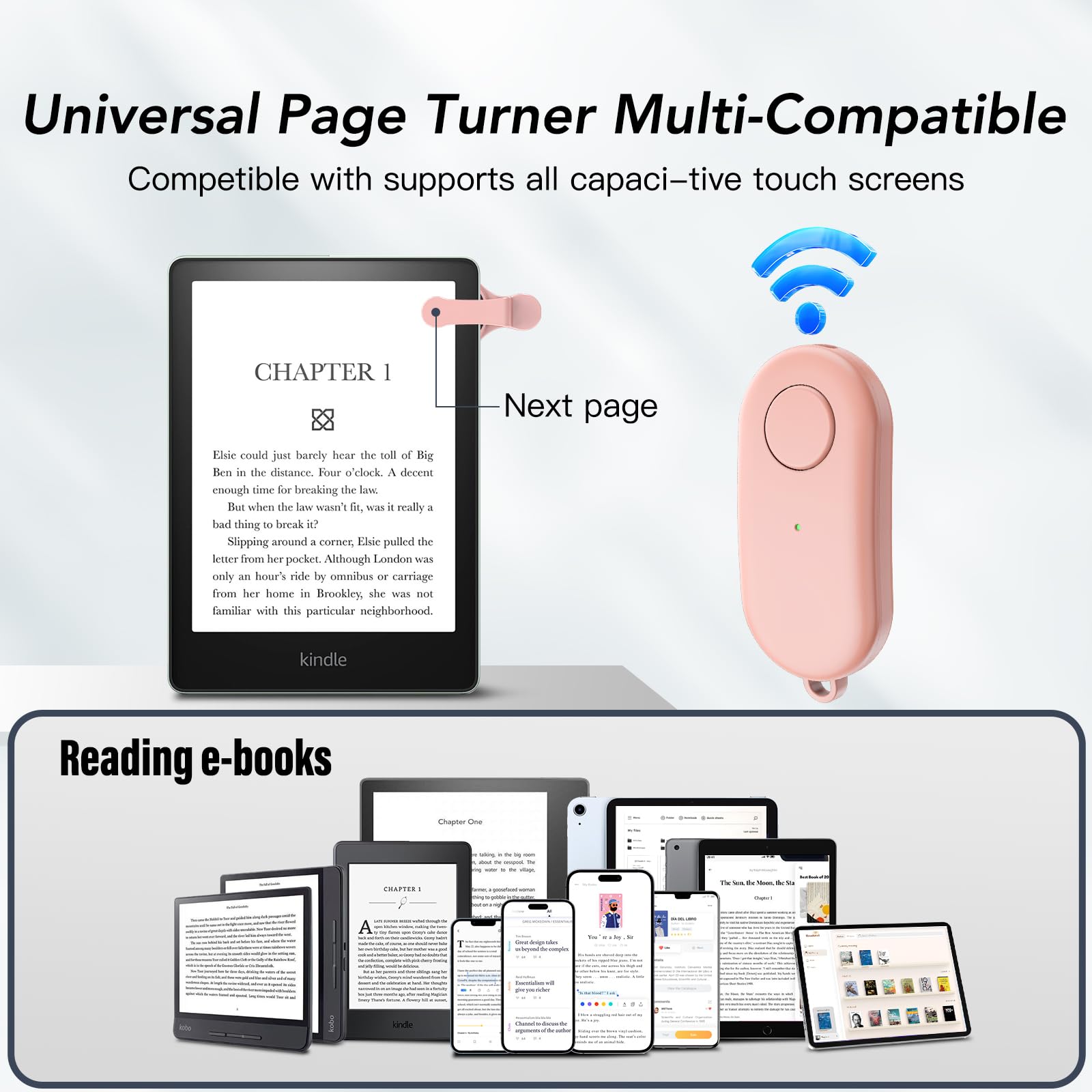 No WiFi No Bluetooth Easy and practical: The page turner does not require a Bluetooth connection. Clip it when you use it, Take it off when not in use. Just press the controller button and go to the next page immediately. It supports all capaci-tive touch screens. Note: please pair before using the page turner. It only supports page forward but not backward. Use a reading device or reading app. Adjust the margins if the page turner covers the text