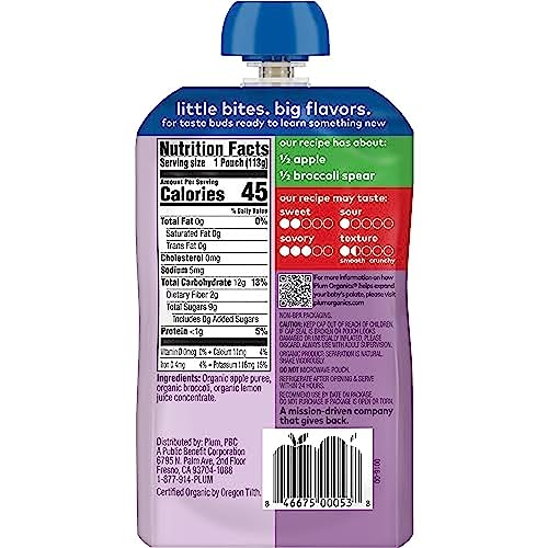 Baby Food for your Little Foodie. Plum Organics Stage 2 (6+ months) organic baby food pouches are made with blends of fruits, veggies, and ingredients that are perfect for exposing your little foodie to unique flavors, textures, and colors. Our Apple and Broccoli blend is made with only non-GMO, organic ingredients for organic baby food that your baby will love. Plum Organics pouches are always naturally preserved, unsalted, unsweetened, and kosher parve. And since our baby food pouches are convenient, portable, and resealable, you can customize portion sizes, whether you're at home or you need a simple snack on the go.