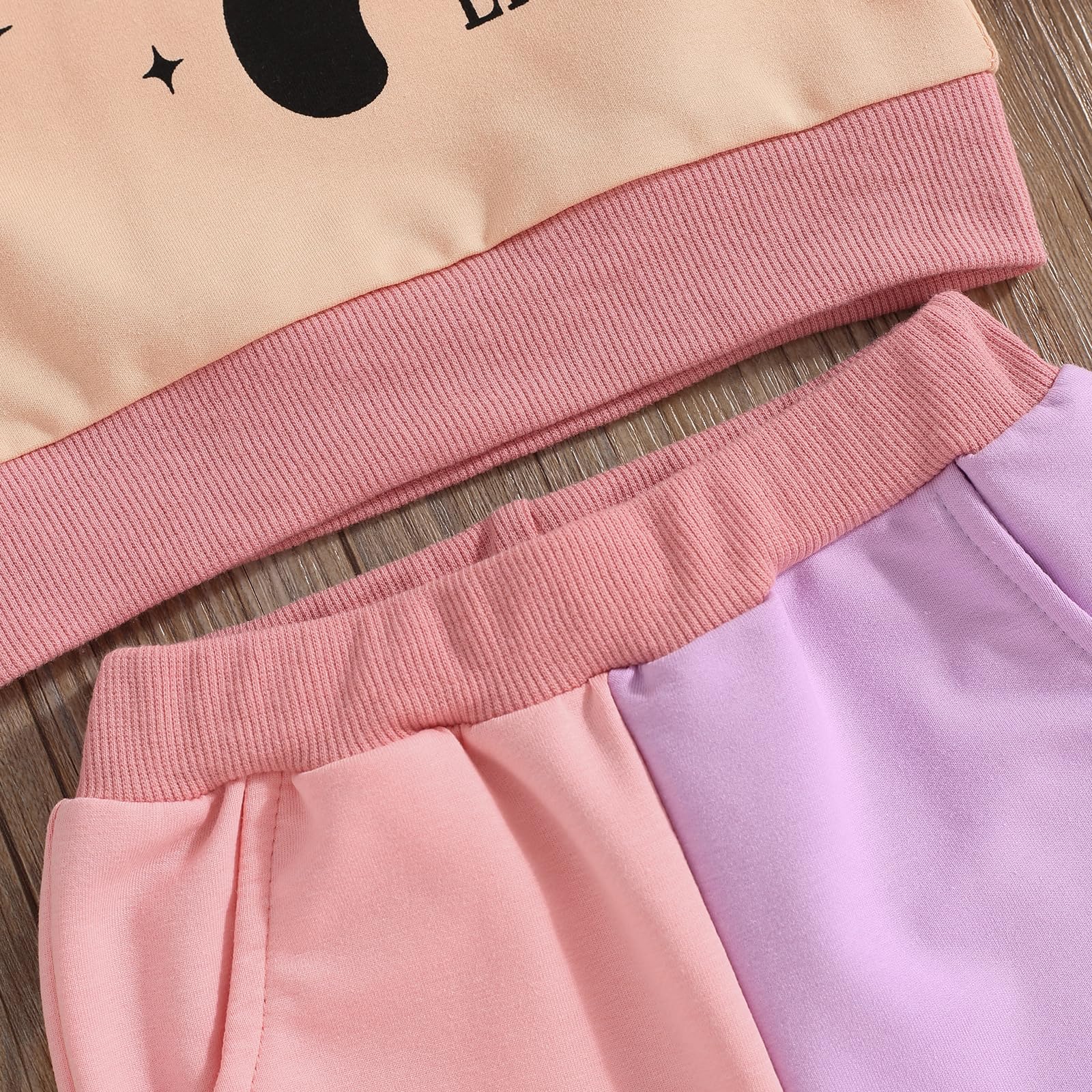 Feature: Toddler girl fall clothes have unique color block and letter print, make your princess more adorable and trendy! Baby girl sweatsuit set is best gift for kids on birthday, graduation, Halloween, Christmas.