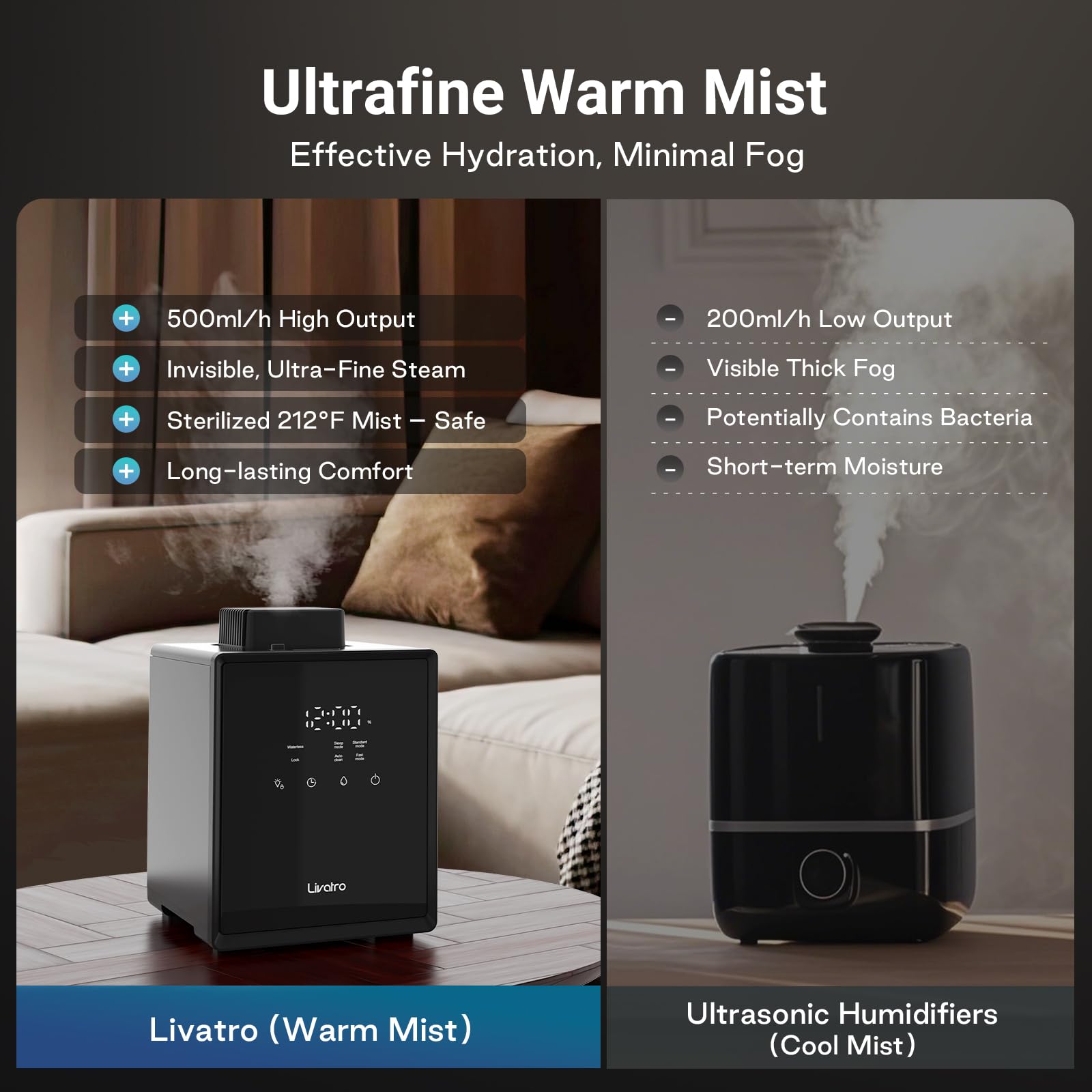 𝐏𝐮𝐫𝐞 𝐚𝐧𝐝 𝐂𝐥𝐞𝐚𝐧 𝐖𝐚𝐫𝐦 𝐌𝐢𝐬𝐭: Compared to ultrasonic humidifiers, our stainless steel warm mist humidifiers heat water to a boiling point, producing healthy and pure steam that delivers soothing moisture. Ideal for alleviating dry skin, nasal congestion, and dry throat. (No filters required, easy operation and saving money)