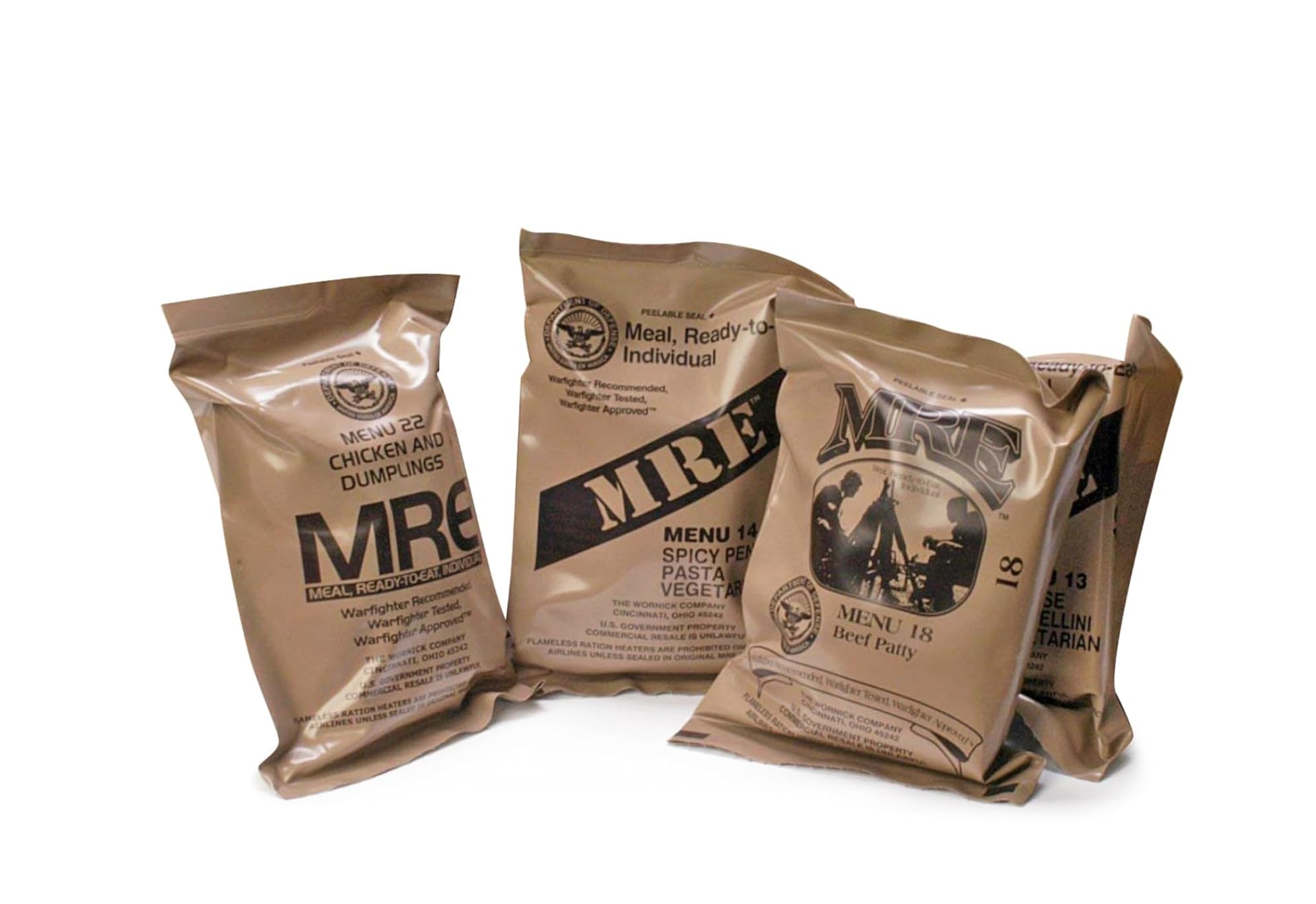 Genuine military surplus MRE's (Meals Ready to Eat). Made in the USA