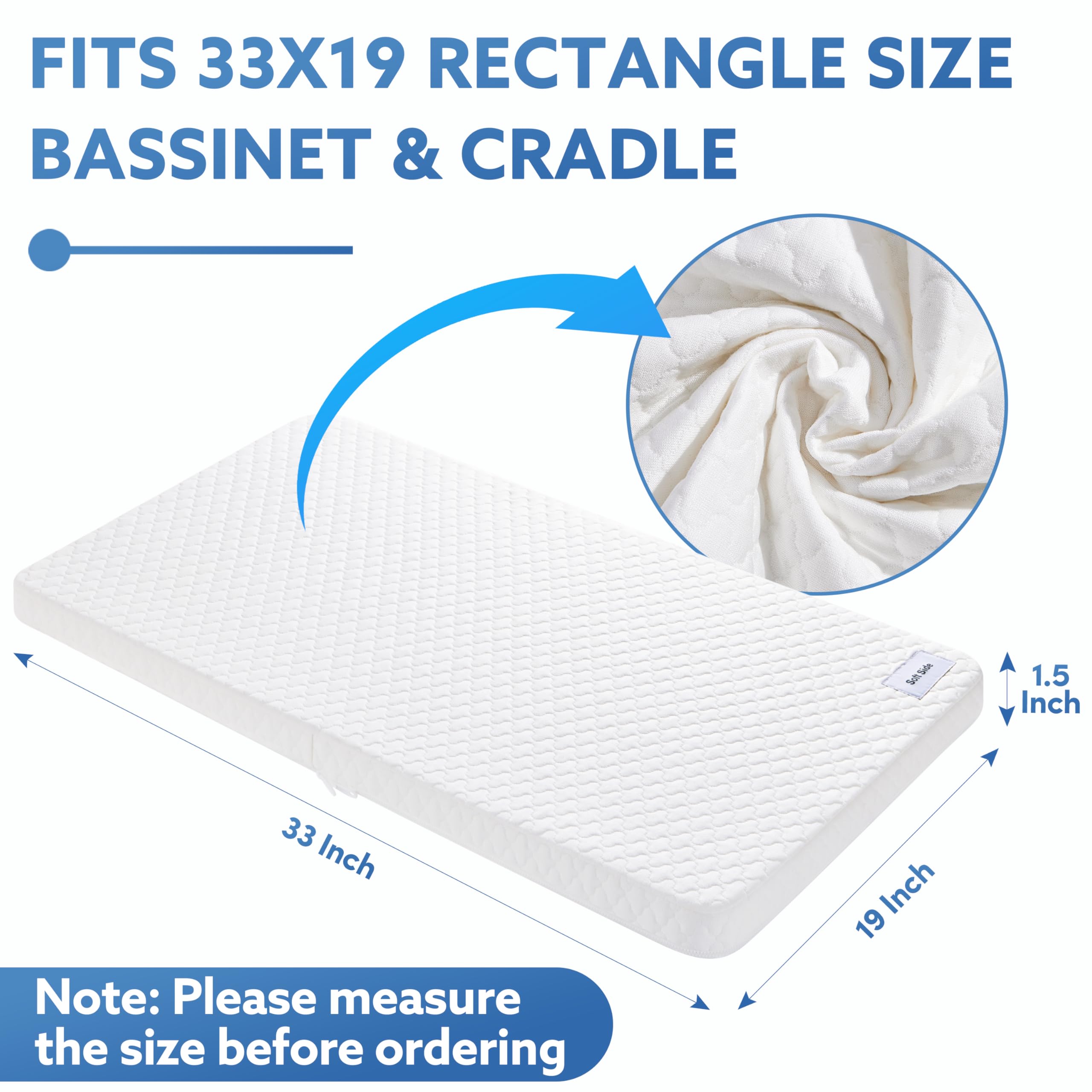 [Universal Size] To ensure the perfect fit, Please measure the inside dimension of your bassinet or cradle before ordering. Select the perfect mattress from our variety of available sizes. Our bassinet mattress measures 33x19x1.5 inch