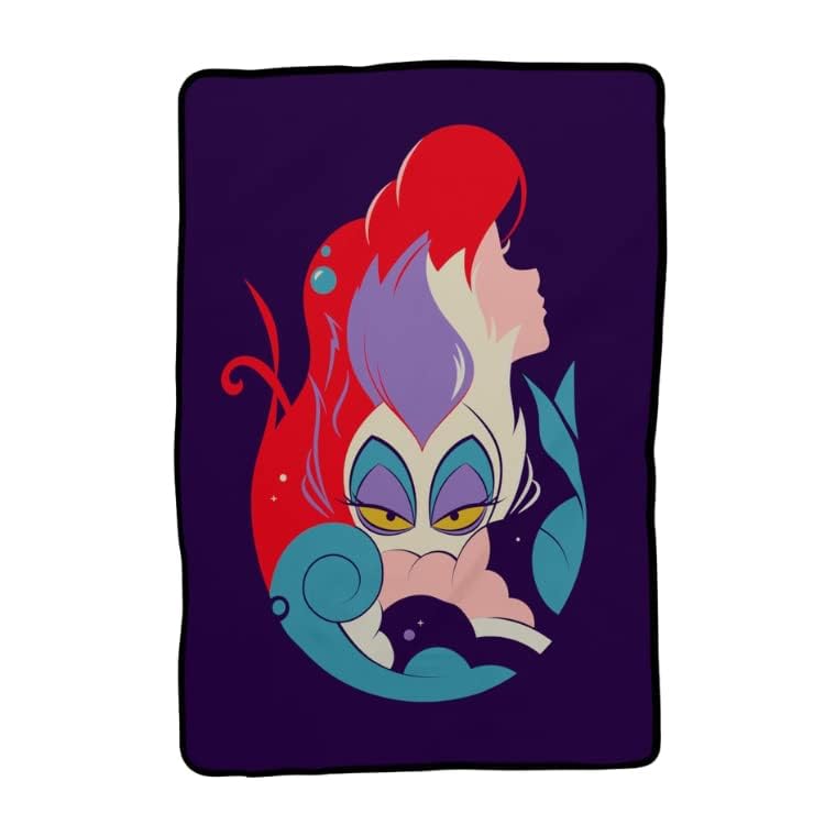 Sing along to your favorite Disney songs in comfort and style under this cozy blanket inspired by Ariel and Ursula in Disney's "The Little Mermaid." Featuring a bold purple background and a vibrant graphic including a combination of Ariel and Ursula's faces, this blanket brings the underwater Disney classic into your home. Whether you are enjoying a nap on the couch or a campout with friends and family, this Little Mermaid blanket is great for any time you want to feel cozy and warm. Made with a super-soft plush Micro Raschel material, this blanket is both lightweight and easy to carry. The wrinkle-resistant fabric helps ensure the blanket always looks its best while on display in your living room or home theater. With a bright orange, blue, and contrasting purple color scheme, this blanket is a unique and colorful interpretation of your favorite Disney princess and her nemesis.