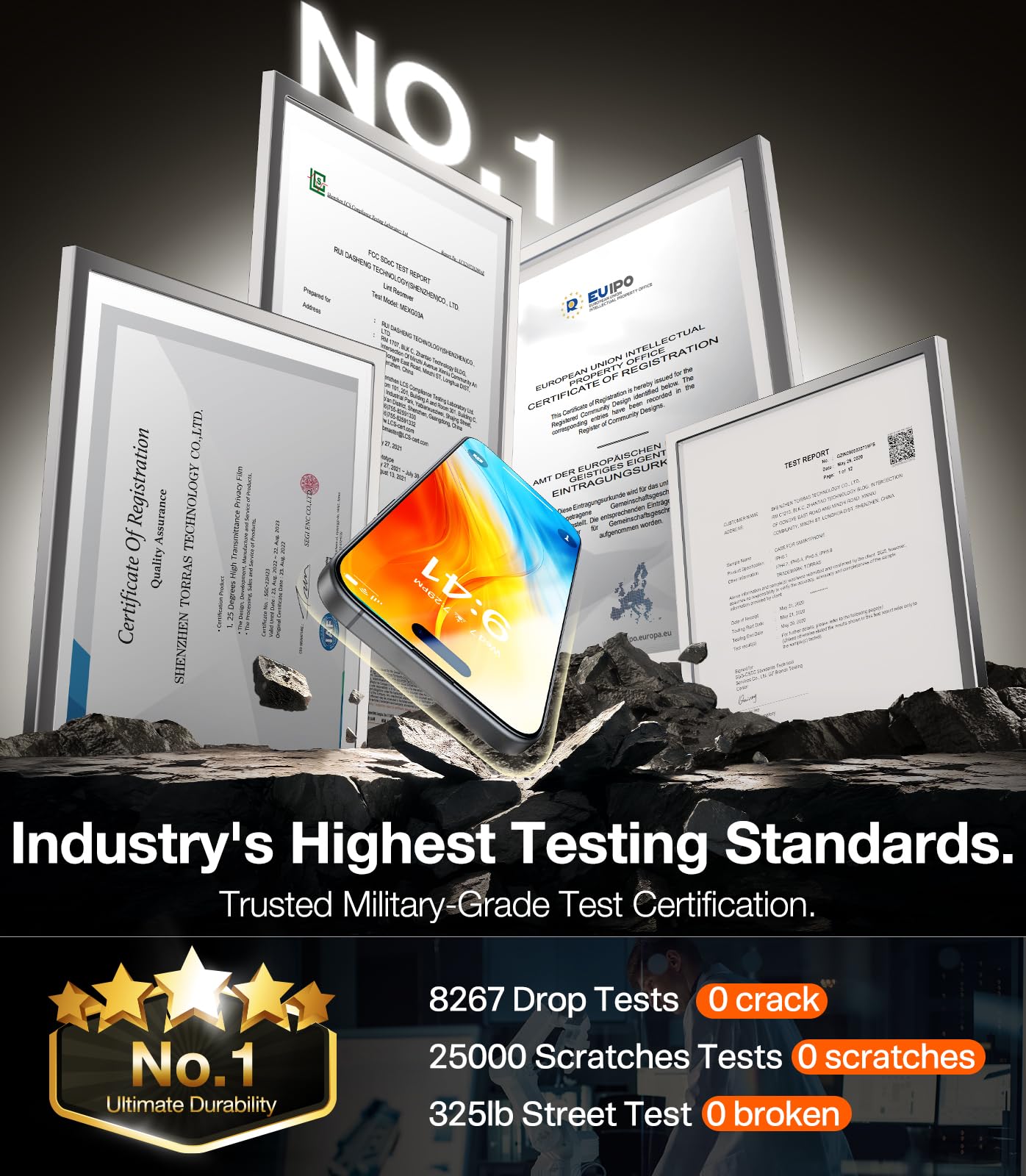 (Only Us - Our Own Lab, Defining New Standards) Meeting the industry's highest testing standards.Tested through 8000+ drop tests (0 cracks), 25000+ scratch tests (0 scratches), 325lb stress test (0 broken) and wear tests. Certified to meet MIL-STD-810H military standards (2025), you need not worry about any unexpected drops or impacts.