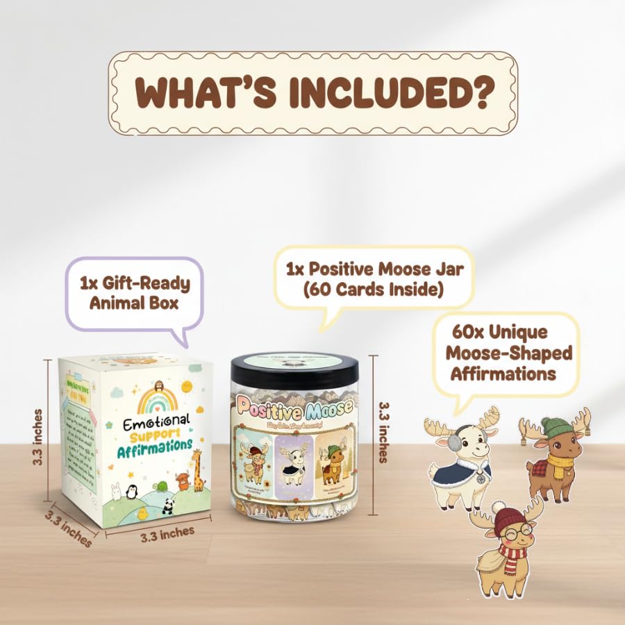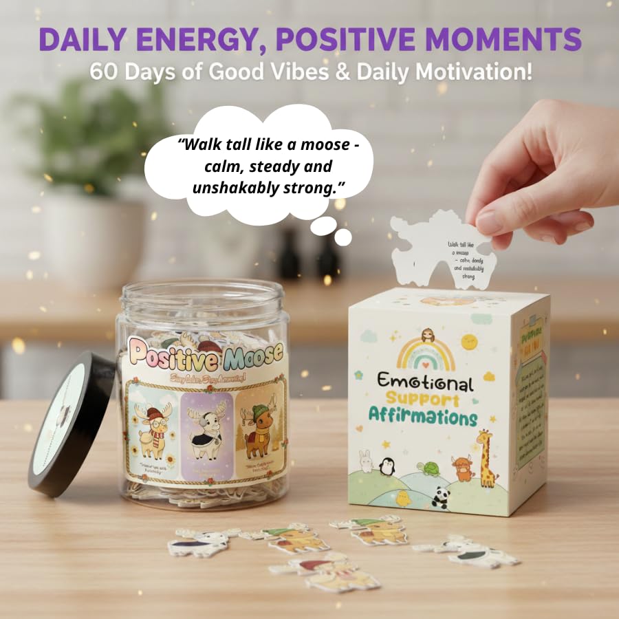 π Daily Positivity & Emotional Support This Positive Moose Jar includes 60 uplifting affirmation cards designed to encourage mindfulness, reduce stress, and bring emotional balance during the cozy winter season.
