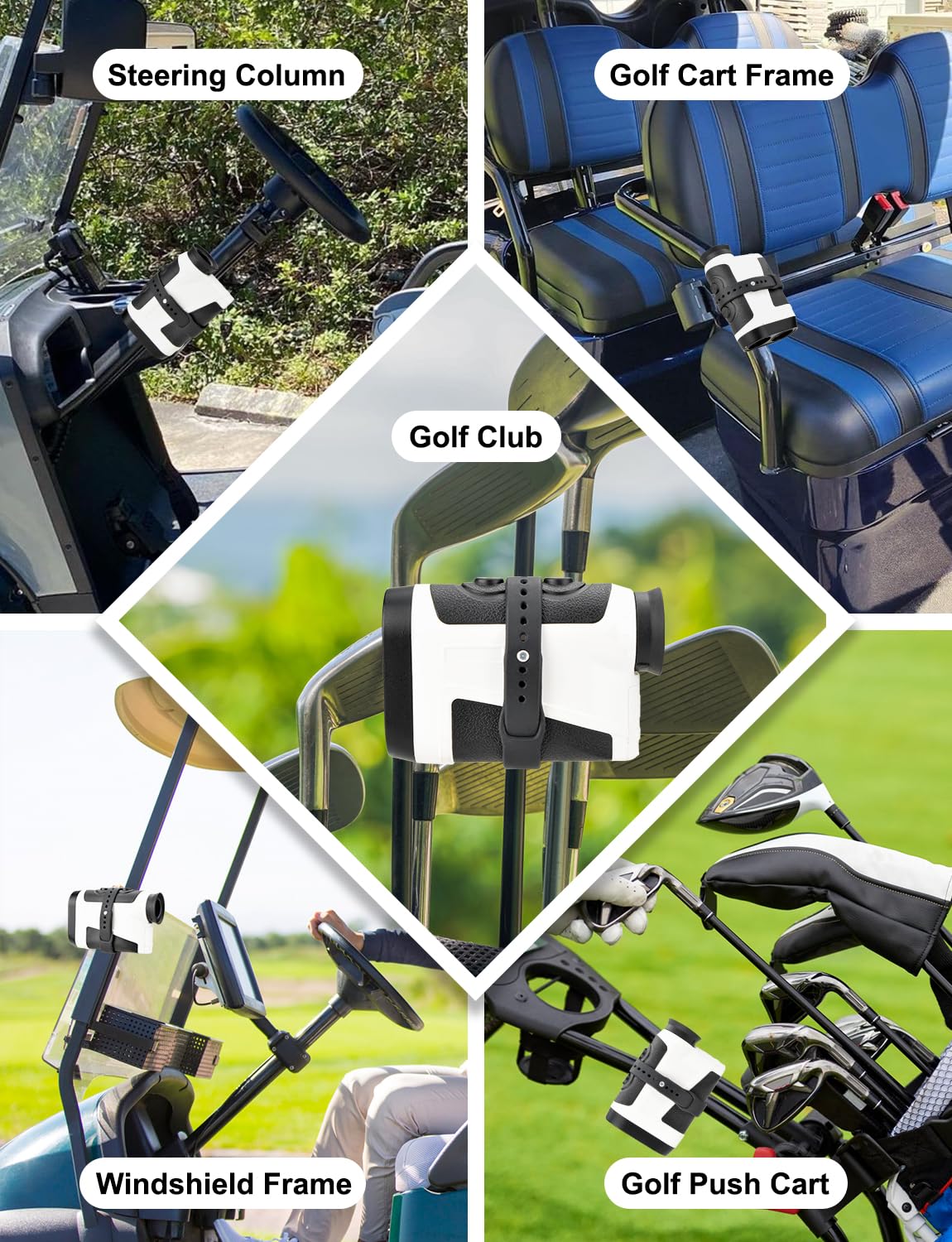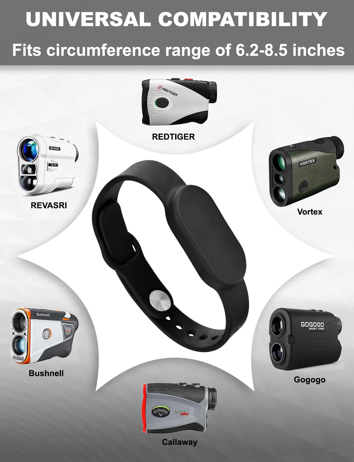 Every Golfers Tool: This golf range finder holder fits all rangefinders with a circumference range of 6.2-8.5 inches. The magnetic rangefinder band is very convenient and always within your reach to access easily. It allows you to free hands without fumbling in the cart