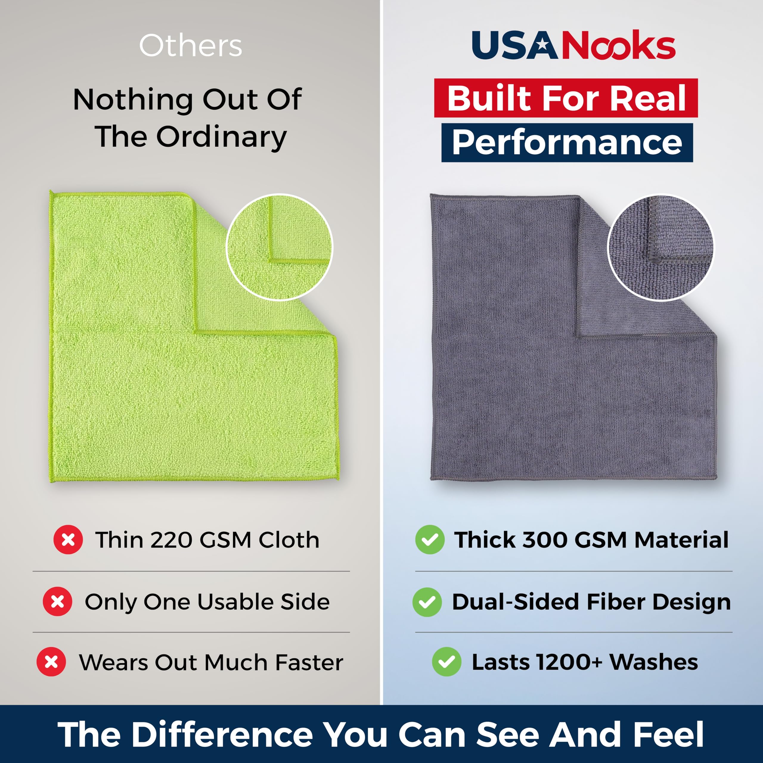 LASTS 1200+ WASHES - That’s 3.27 YEARS worth of use in this 12-pack of COMMERCIAL GRADE 300 GSM Reuseable Cleaning Cloth. The 2.5mm thickness and OVERLOCK BRAIDED STITCHING makes the ideal SUSTAINABLE SOLUTION for cleaning every SURFACE, crack, and CREVICE in your home, garage, or office.