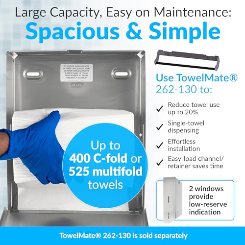 Dispenses 400 C-Fold or 525 multifold towels (3 1/8-Inch to 3 13/16-Inch) without adjustments or adapters