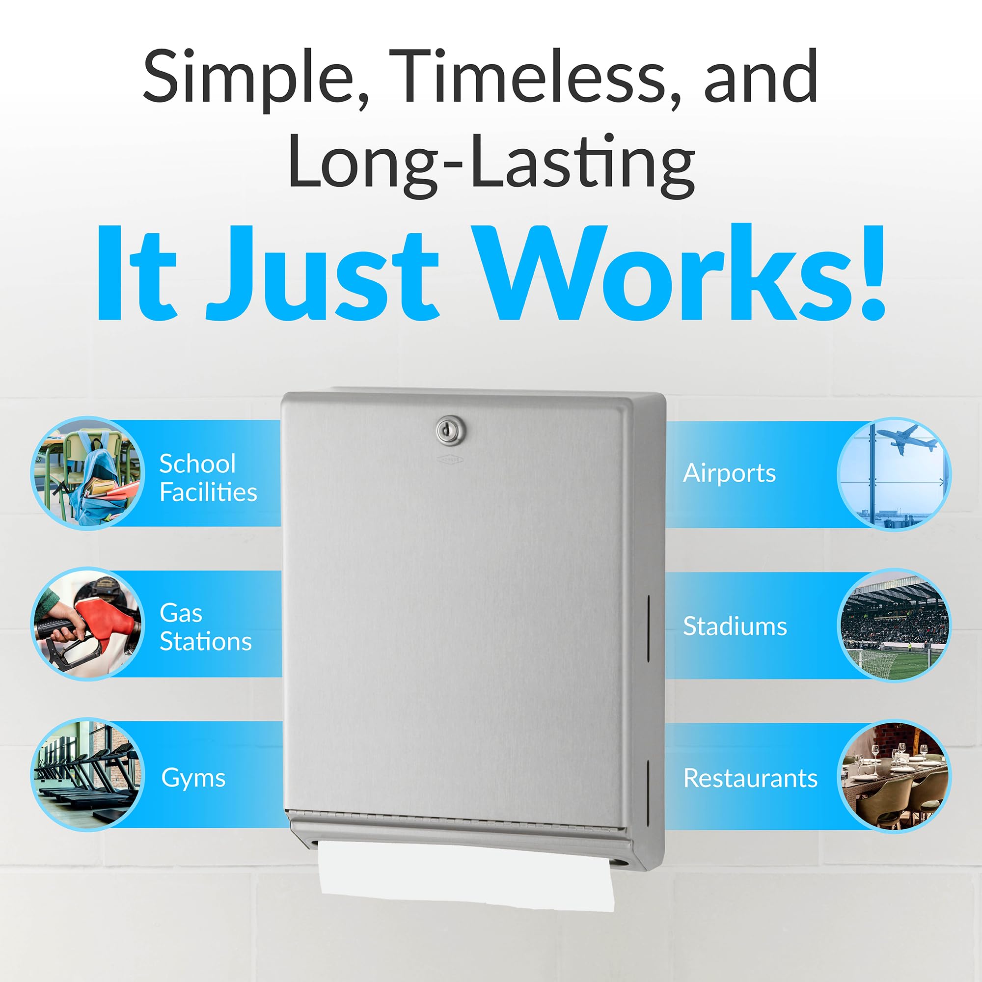 Durable Structure & Hassle-Free Installation - Our paper towel dispenser is designed with all-welded construction, no sharp edges, and a full-length piano hinge. It's built to last longer with type 304 stainless steel. This commercial bathroom towel dispenser is easy to refill, easy to clean, and easy to install. It just works.