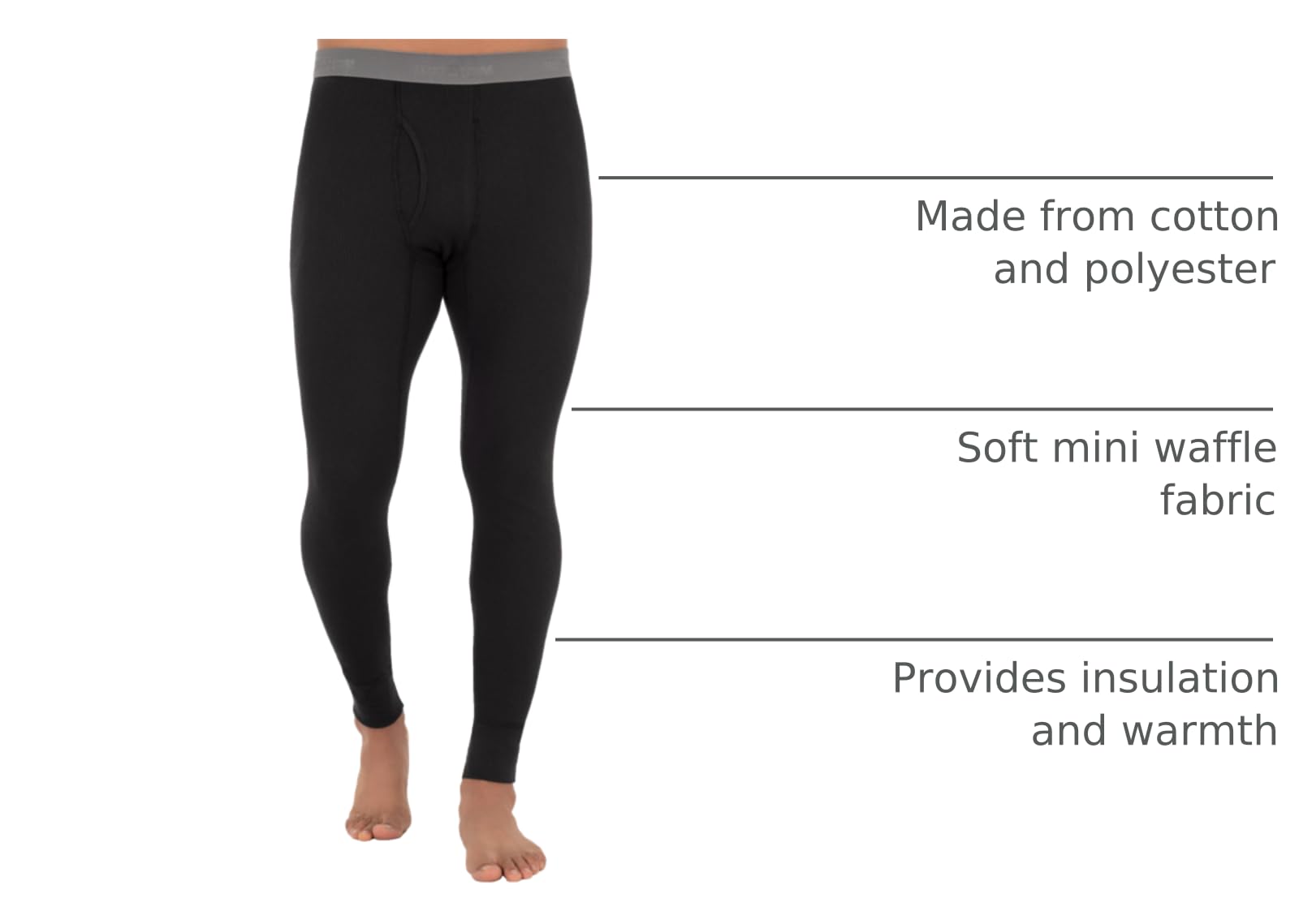 Description Whether youβre looking for foundational warmth, lightweight performance, or both, this Fruit of the Loom Premium Menβs Thermal Bottom certainly has you covered. Made from U.S. sourced cotton and recycled polyester, this menβs base layer has a bulk-free fitted style and is built for protection, performance, and utmost comfort when youβre active outdoors in cold to moderately cold conditions. The natural breathability of cotton offers moisture-wicking to keep you dry, and the natural stretch offers flexible comfort that does not restrict your movements. The fabricβs waffle weaves create small air pockets that hold heat next to the body, and the rib cuffs at the ankles ensure heat stays trapped as much as possible. Additional features like a plush elastic waistband, front fly opening, and flat seams prevent chafing and enhance overall comfort. This Fruit of the Loom Premium Menβs Thermal Bottom is a must-have essential for your winter wardrobe.