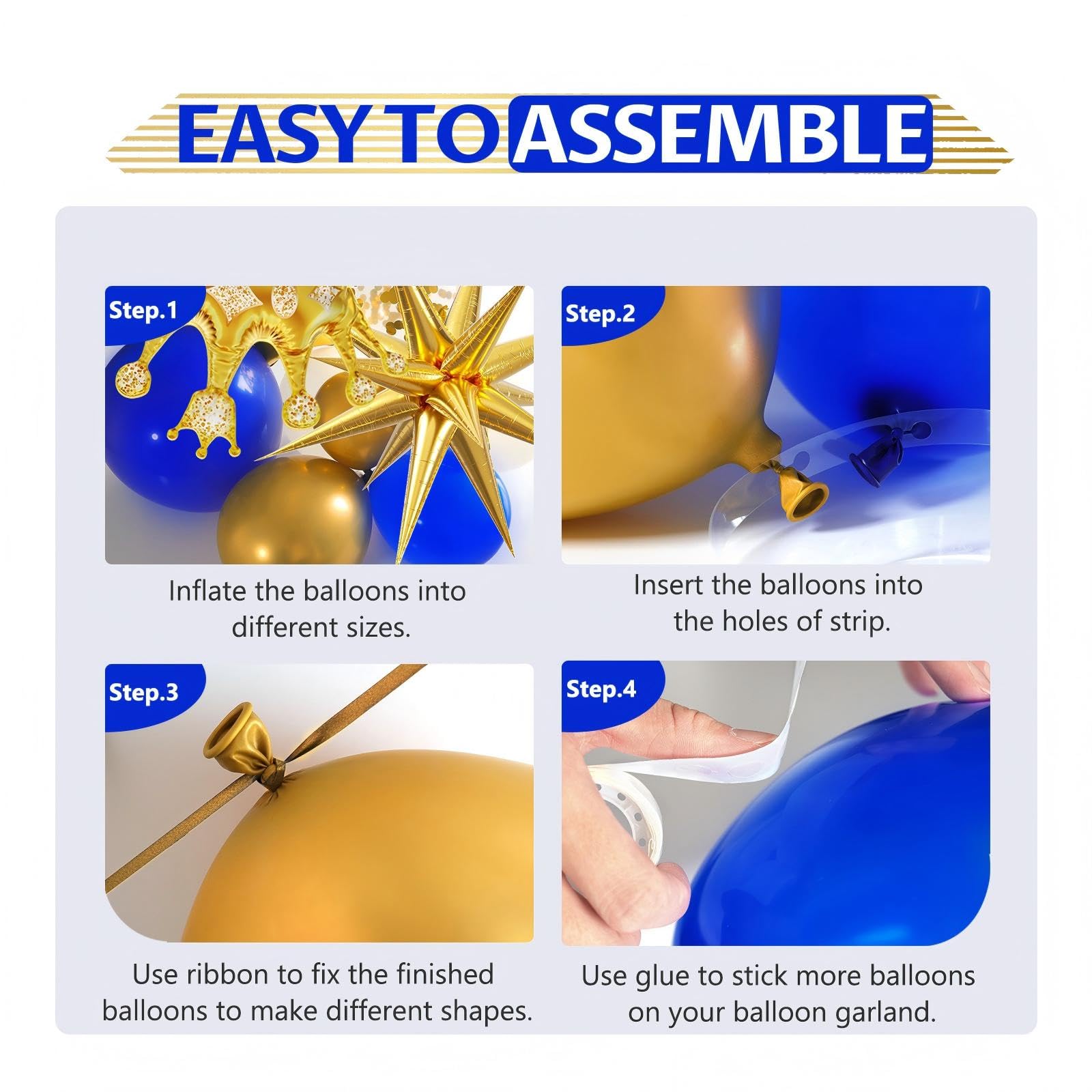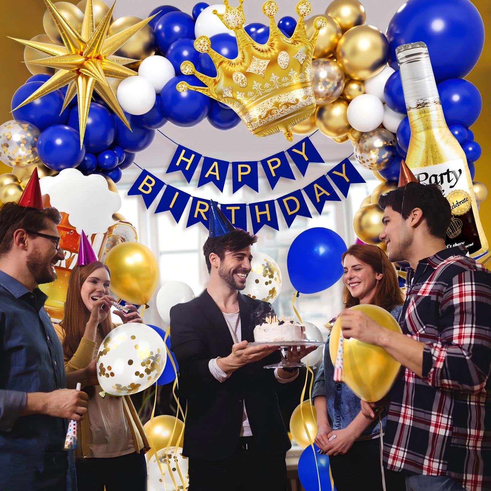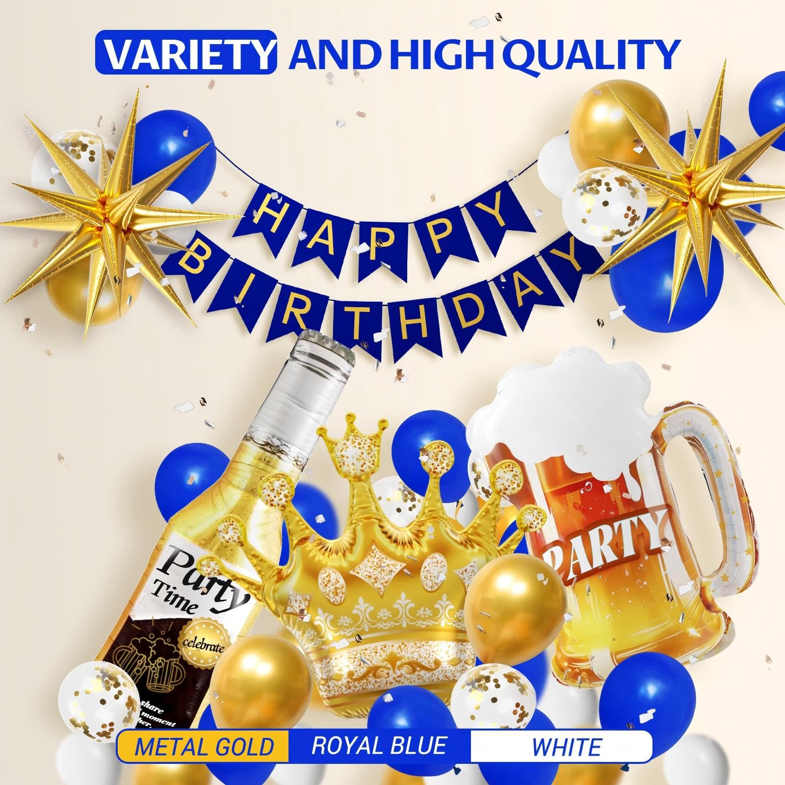 Package Include: 56pcs royal blue balloons (1pcs 18inch, 10pcs 12inch, 15pcs 10inch, 30pcs 5inch), 21pcs metallic gold balloons(1pcs, 18inch, 10pcs, 10inch, 10pcs, 5inch), 30pcs 5inch white balloons, 5pcs 12inch gold confetti balloons, 2pcs 22inch gold star balloons, 1pcs 17x35inch foil balloon, 1pcs 17.7x23.6inch mug cheers balloon, 1pcs 24inch gold Headwear Balloons, 1pcs happy birthday banner, 1pcs roll glue dot, 1pcs decorating strip , 1pcs black ribbons