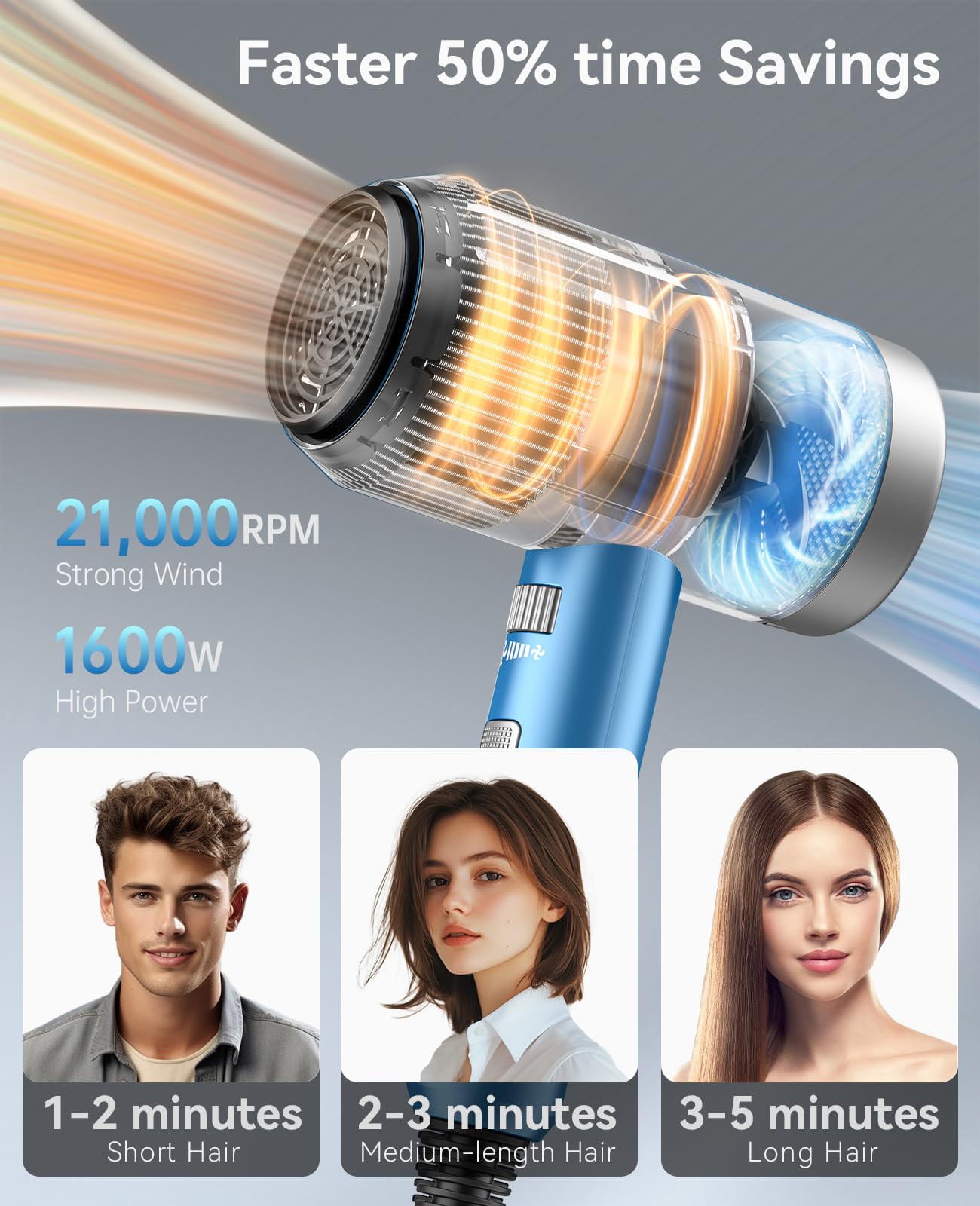 【1600W Premium Motor Hair Dryer】 Our ionic hair dryer delivers stronger wind for drying in less time compared with others, Lightweight & Portable Travel Hair Dryer. High - speed motor, up to 21,000 rpm.