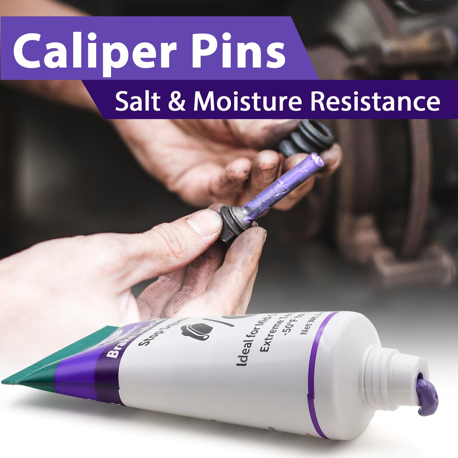 Extreme-Temp Brake Caliper Grease: High-performance brake grease combines synthetic MCA + ceramic powder to resist melting, even at 3000°F. Ideal for brake slide pins, calipers, and high-friction parts.