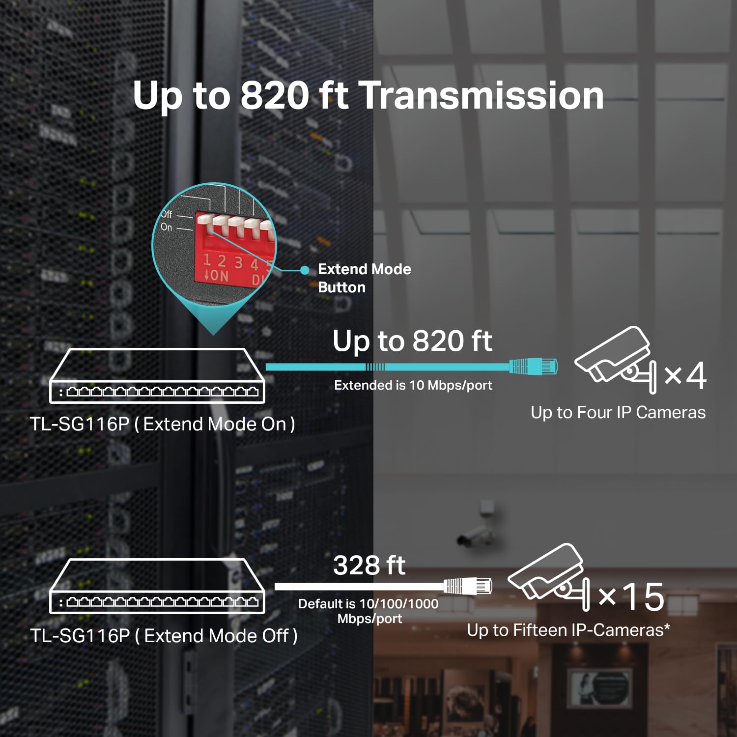 𝐄𝐱𝐭𝐞𝐧𝐝 𝐌𝐨𝐝𝐞: Up to 250m data and power PoE transmission range under Extend Mode, ideal for surveillance system (Speed will be downgraded to 10 Mbps).