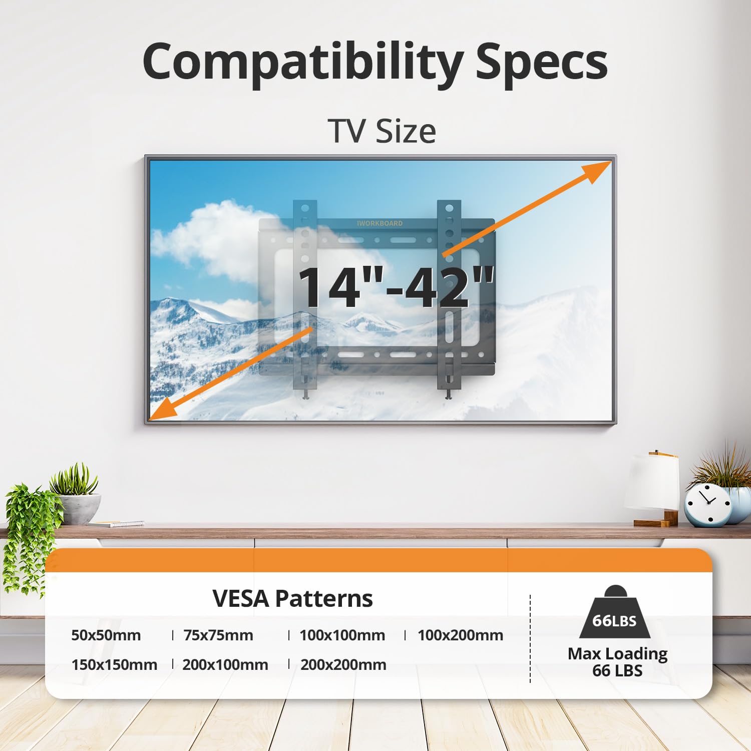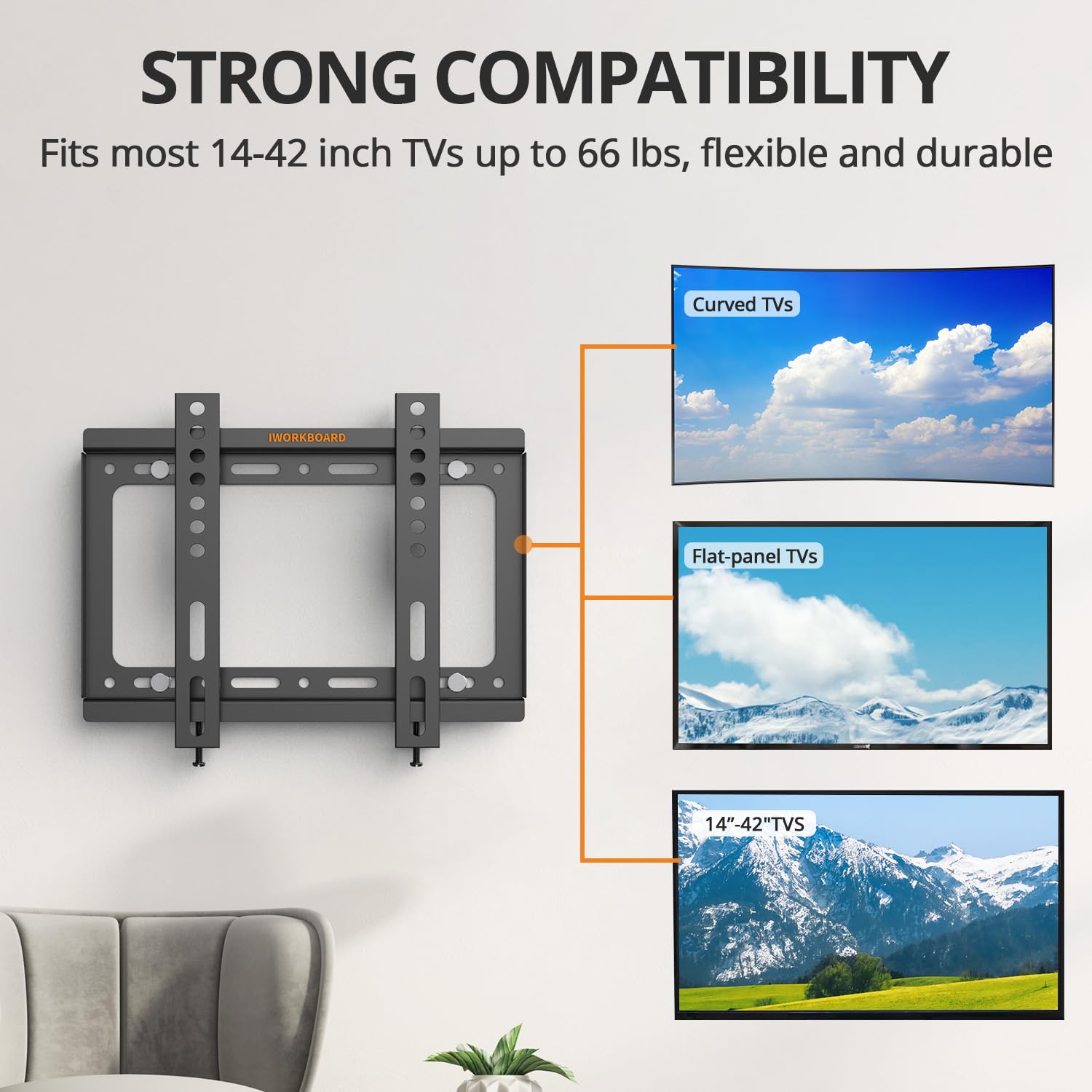 【UNIVERSAL COMPATIBILITY】This TV wall mount bracket is designed to fit a wide range of 14 15 16 17 18 20 24 25 26 30 32 35 38 40 42 inch TVs up to 66 lbs, providing a versatile solution for your home entertainment setup; It securely mounts to wood studs, concrete, and brick walls for reliable performance