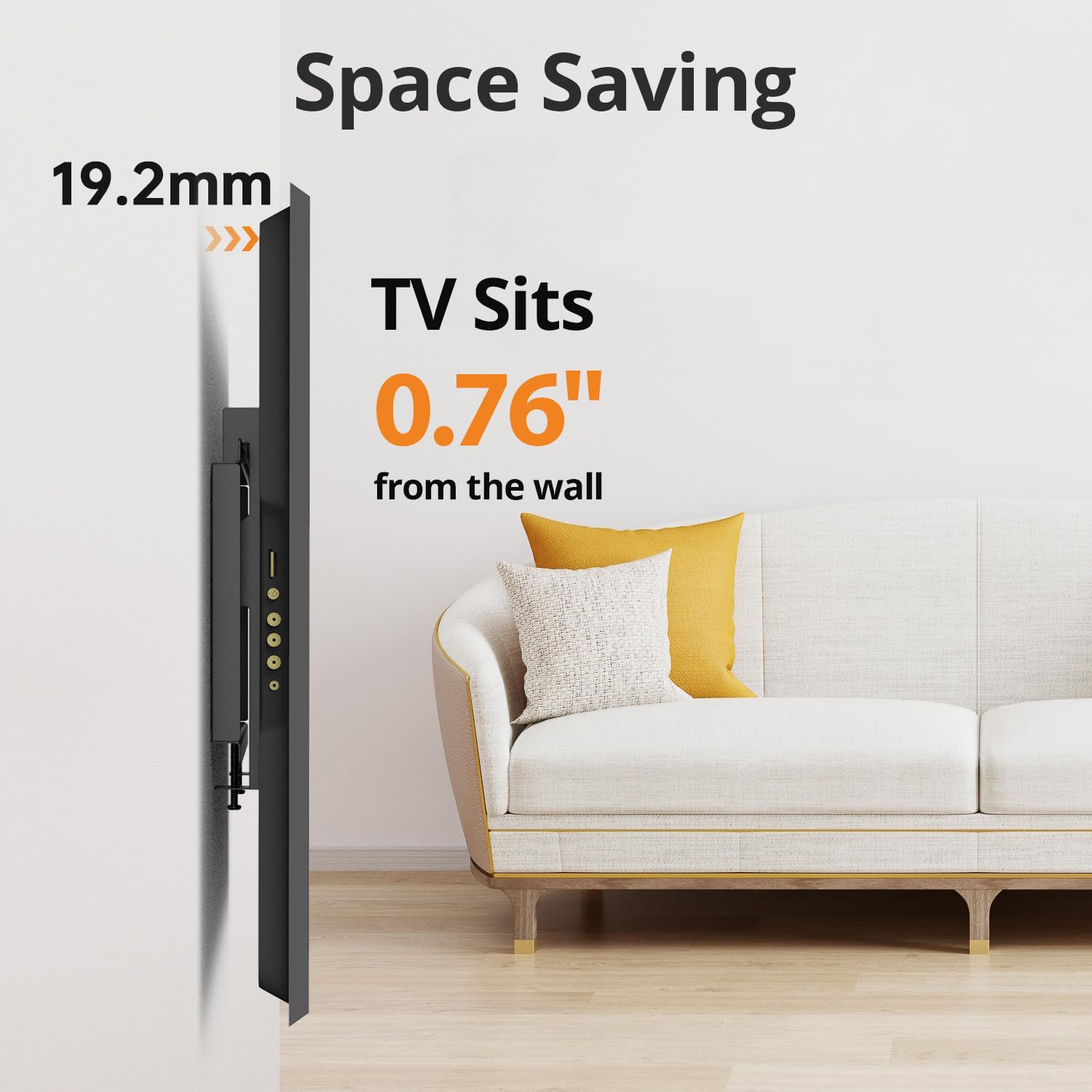 【SPACE-SAVING SLIM PROFILE】Achieve a sleek, modern look with an ultra-thin design that positions your TV just 0.76 inches from the wall; The integrated safety lock mechanism enhances stability by securely fastening the TV to the bracket for added peace of mind