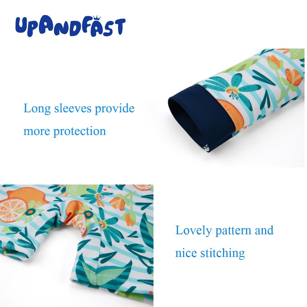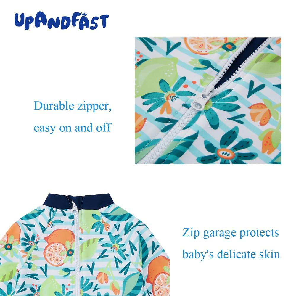 HUMANIZATION DESIGN: This one-piece baby bathing suit has a front / back zip for convenient putting on and taking off. Zipper flap and garage protect your baby's delicate skin