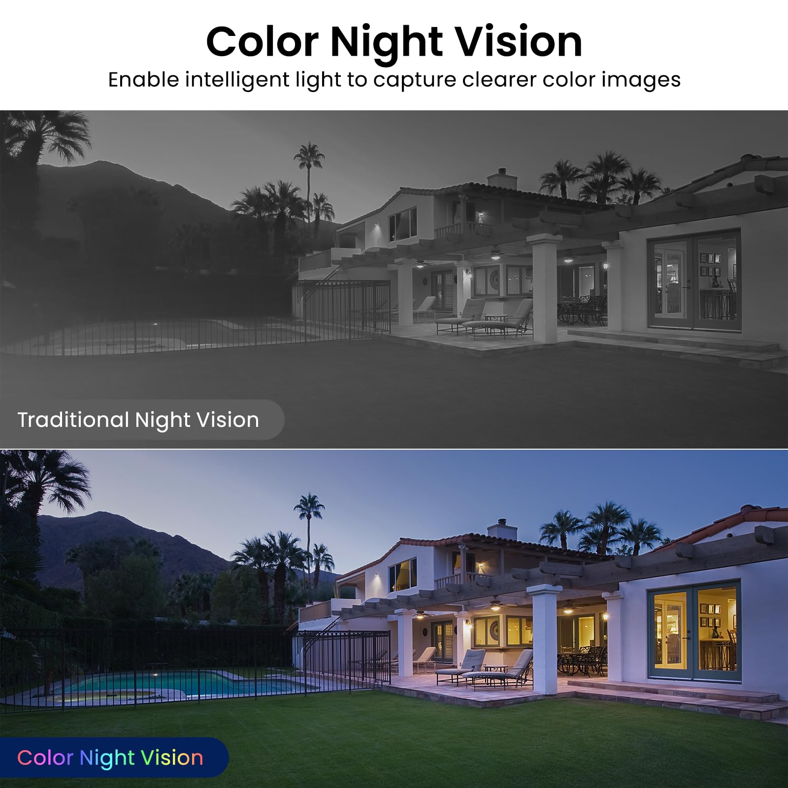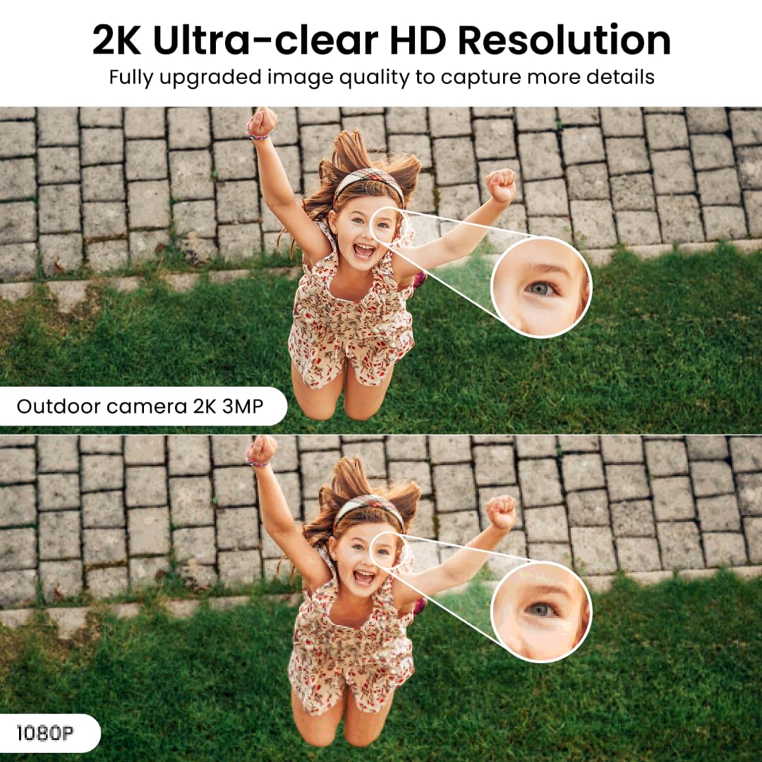 【2K Resolution & Color Night Vision】This 2K Ultra HD security camera is designed for indoors and outdoors. You can choose to install indoor and outdoor cameras for home security in the kitchen, living room, bedroom, baby room, yard, garage, etc. You can not only capture high-definition surveillance footage through the security camera outdoor during the day, but also see colorful images at night. The outdoor camera provides comprehensive and multi period services for your home security.