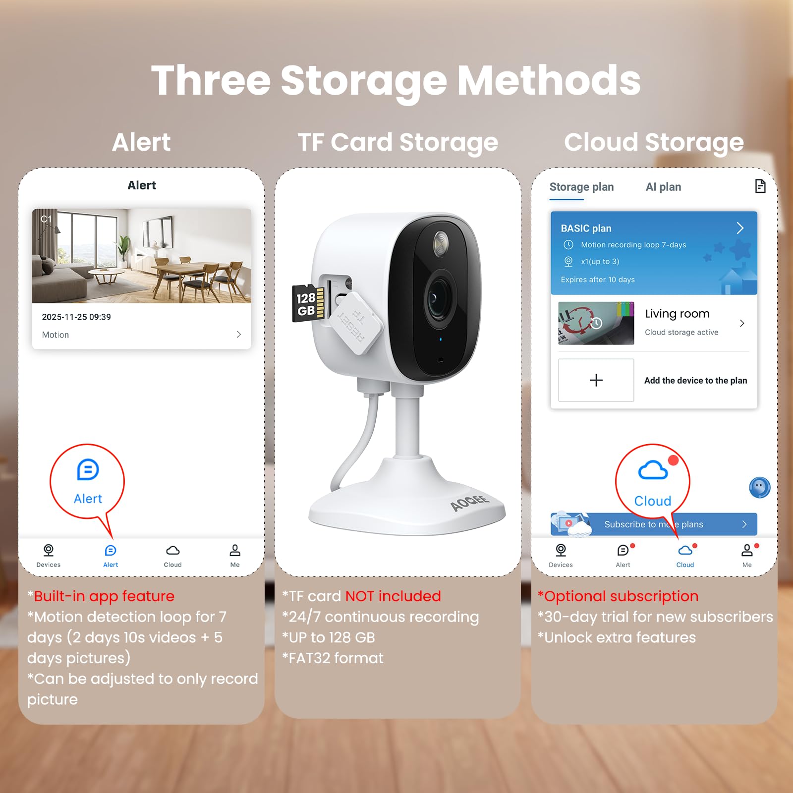 【24/7 SD Card Storage & Optional Cloud】 The wifi outdoor camera features in-app 10s alert video clips or pictures. It also supports TF card (up to 128GB, not included) or cloud storage (with a 30-day trial). Both storage ways allow for 24/7 continuous recording, ensuring that you can play back your videos whenever you want. This indoor camera also has advanced encryption technology to protect your privacy, so even if the home security cameras are stolen, no one can access your recorded videos.