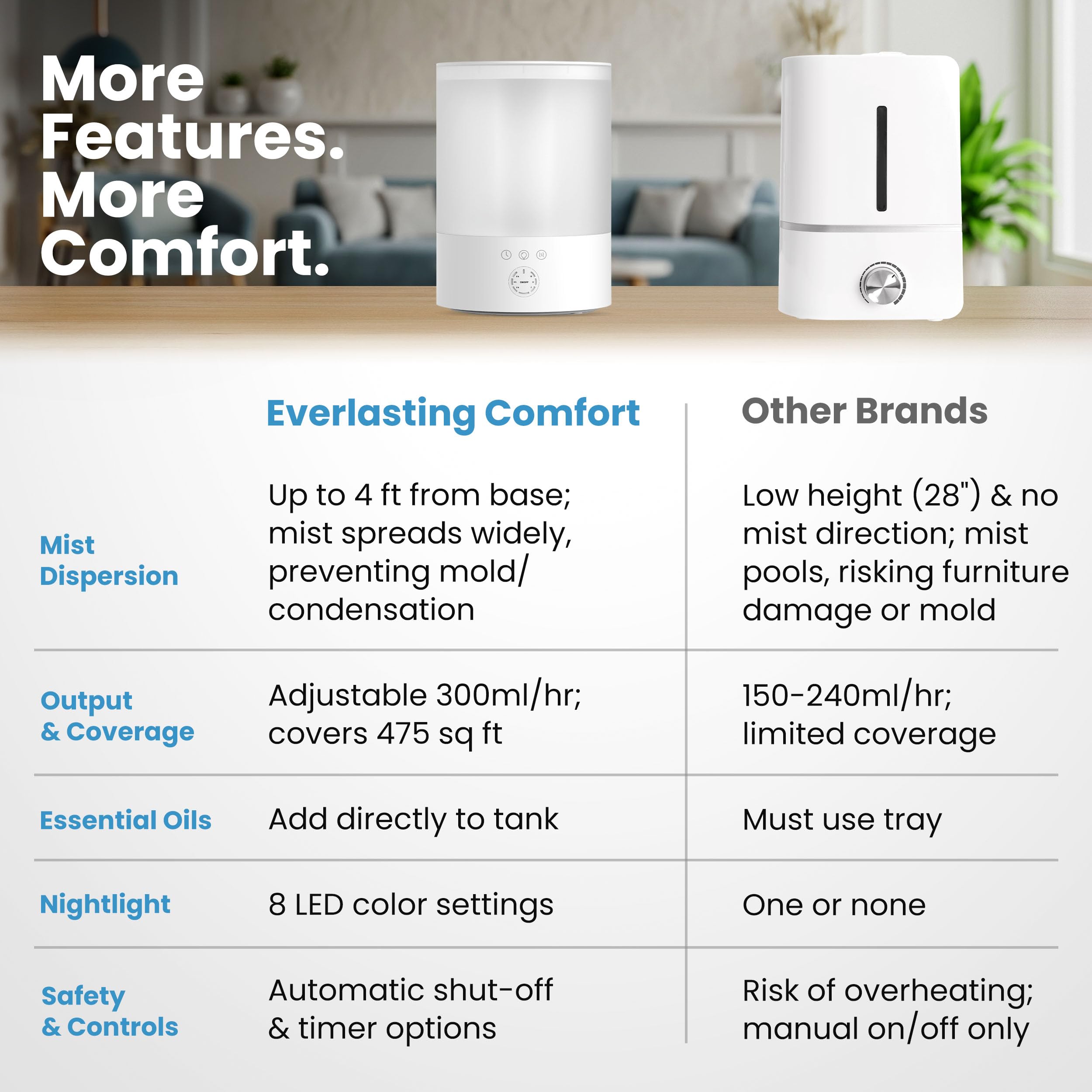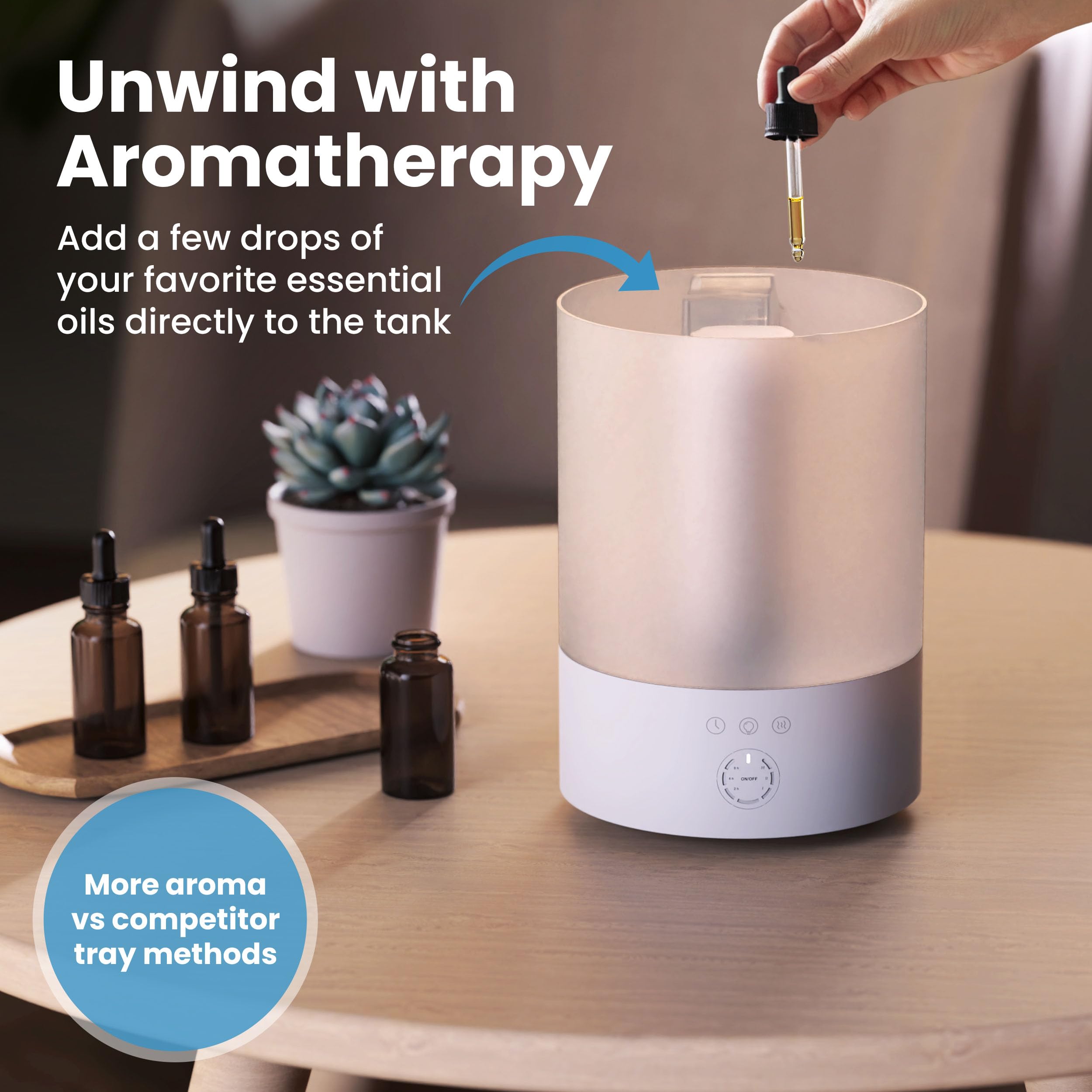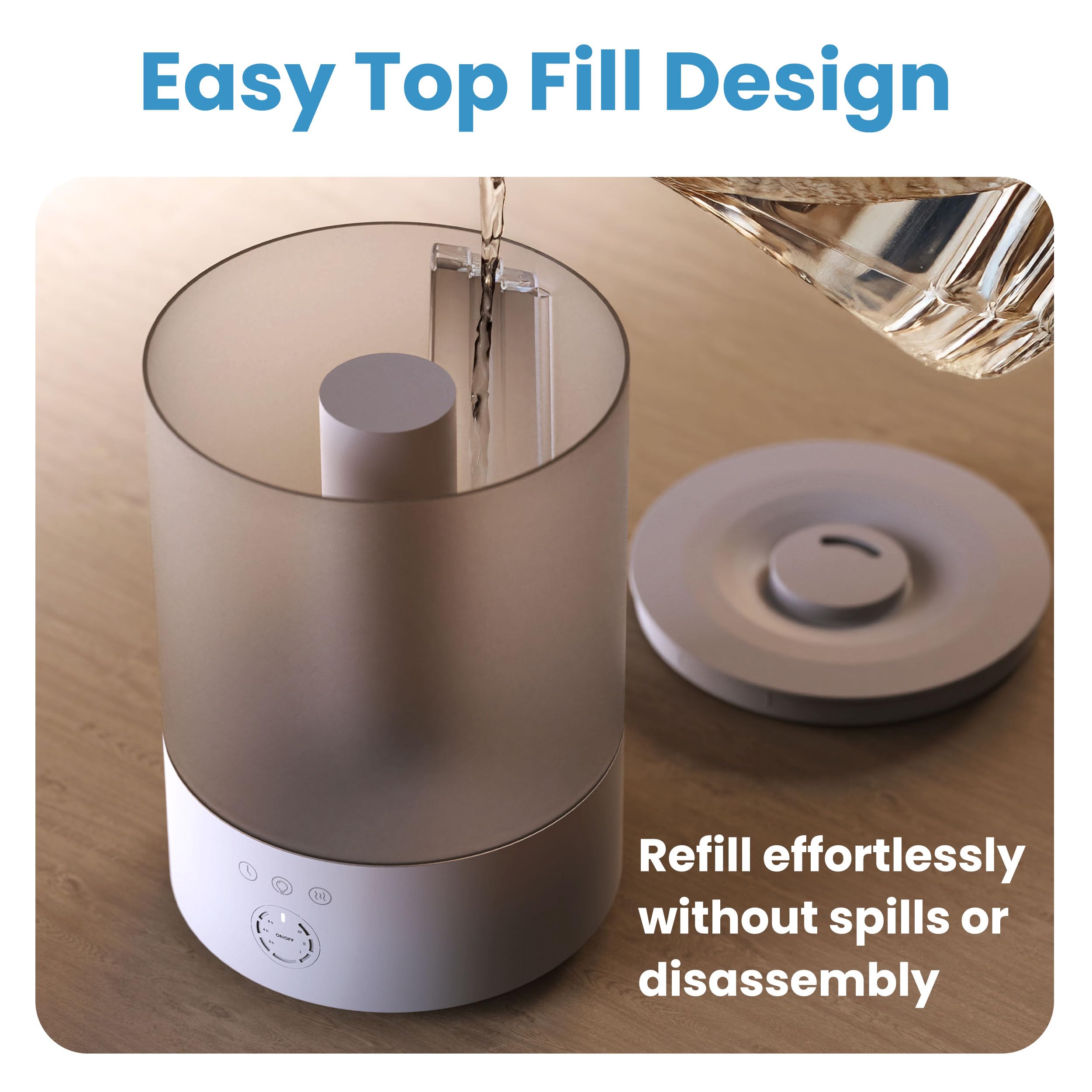 ENERGY-EFFICIENT TIMER & AUTO SHUT-OFF: Equipped with 2, 4, and 8-hour timer options, this humidifier large room saves energy while giving you precise control. With a 24 hour run time, the built-in auto shut-off activates when the water runs low, providing safe, worry-free operation during the day or overnight. Ideal for children’s rooms, apartments, portable for dorms, it adds consistent humidity for healthier air, restful sleep, and protection for furniture and plants in your house