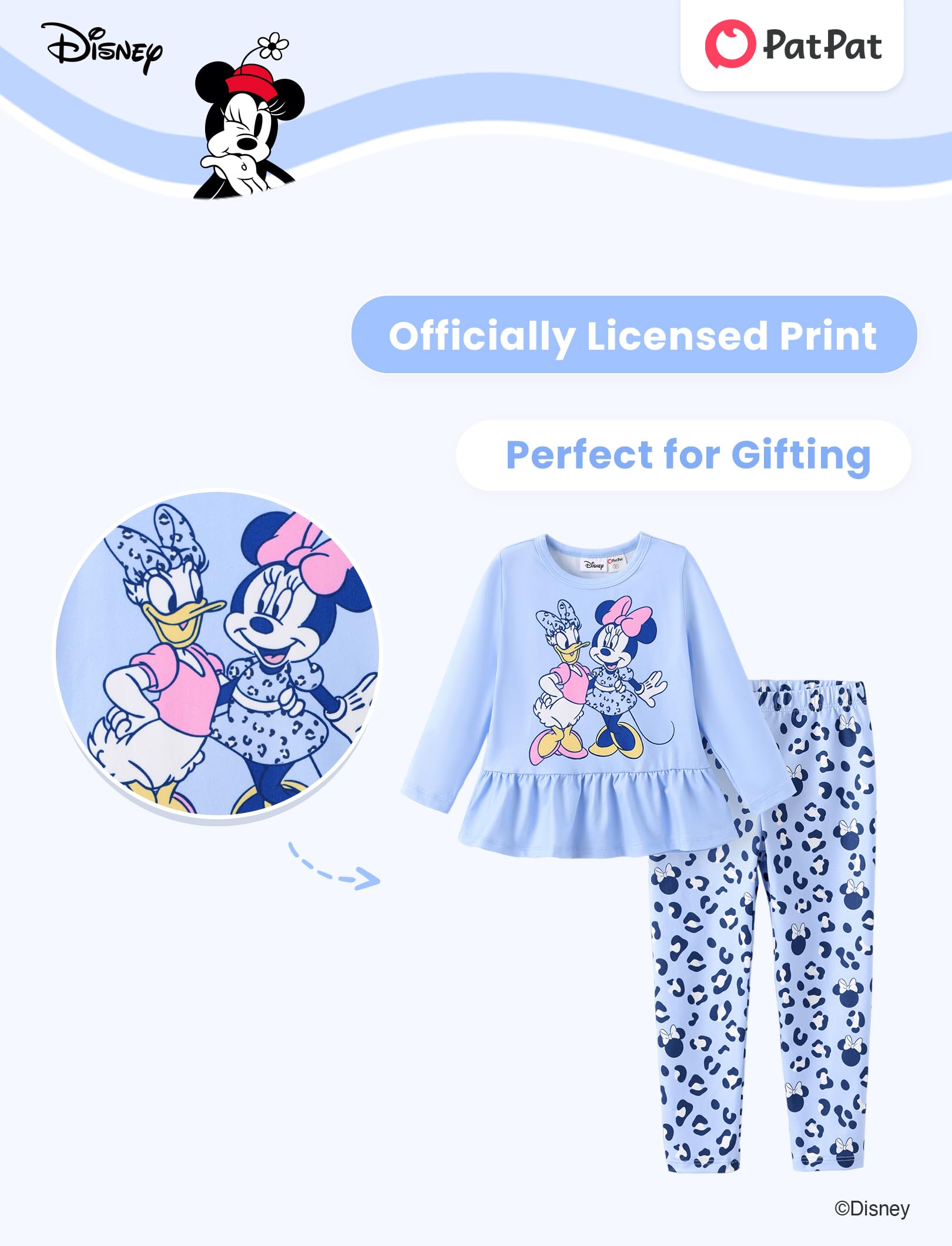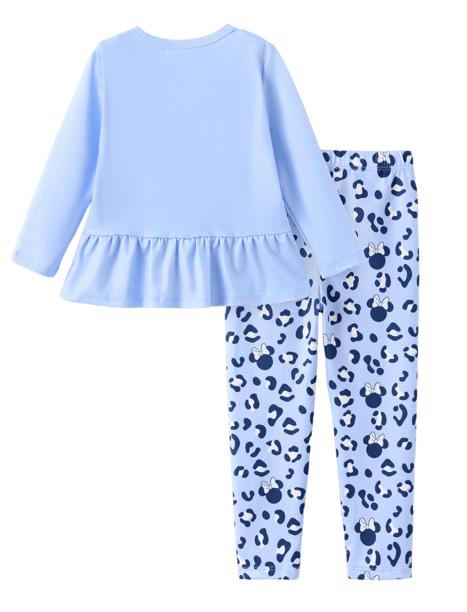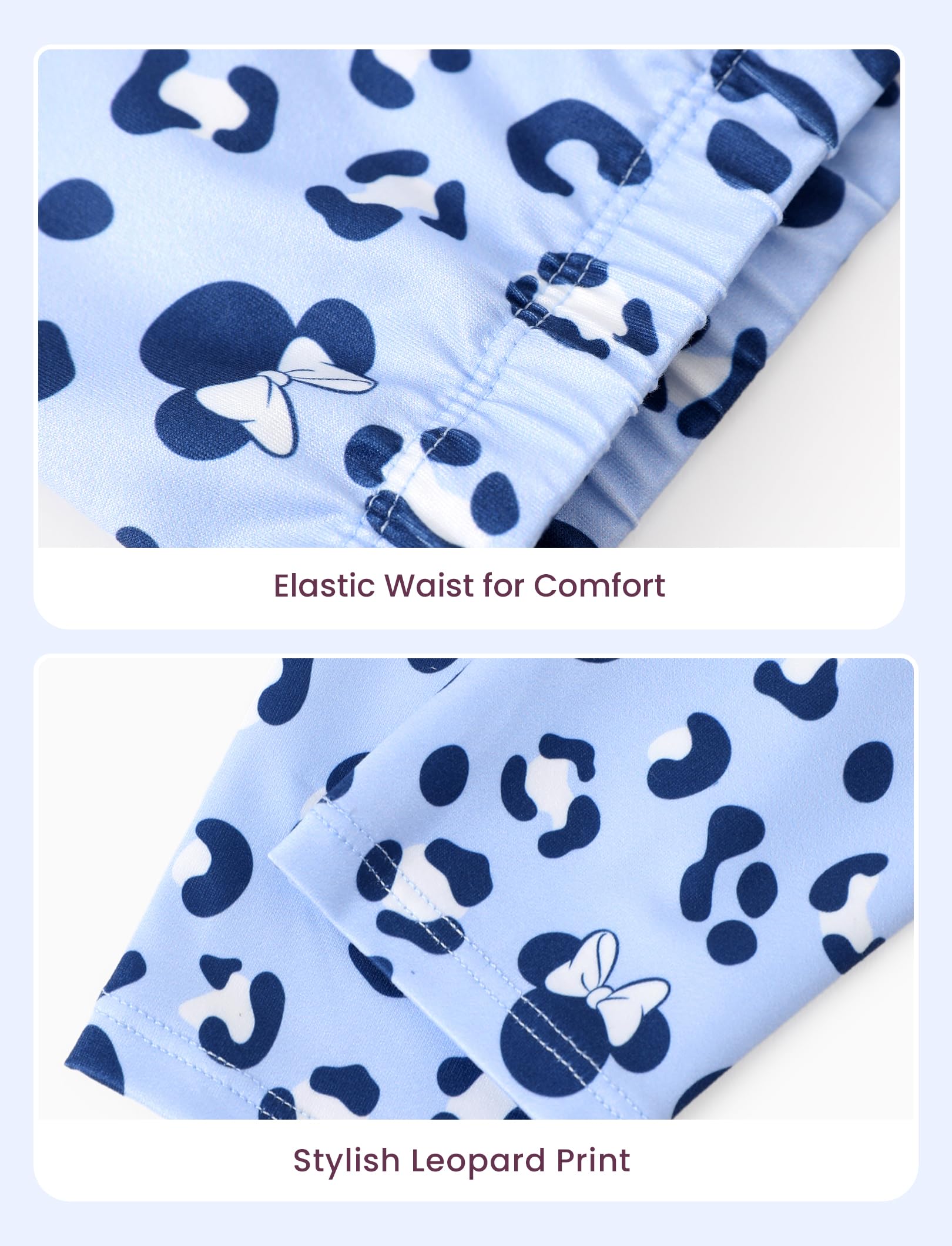 Sweet & Stylish Design:This girls' outfit includes a lightweight ruffle-hem light blue top with a cute Minnie Mouse and Daisy Duck graphic, paired with chic leopard print leggings featuring subtle Minnie head details and a comfy elastic waistband