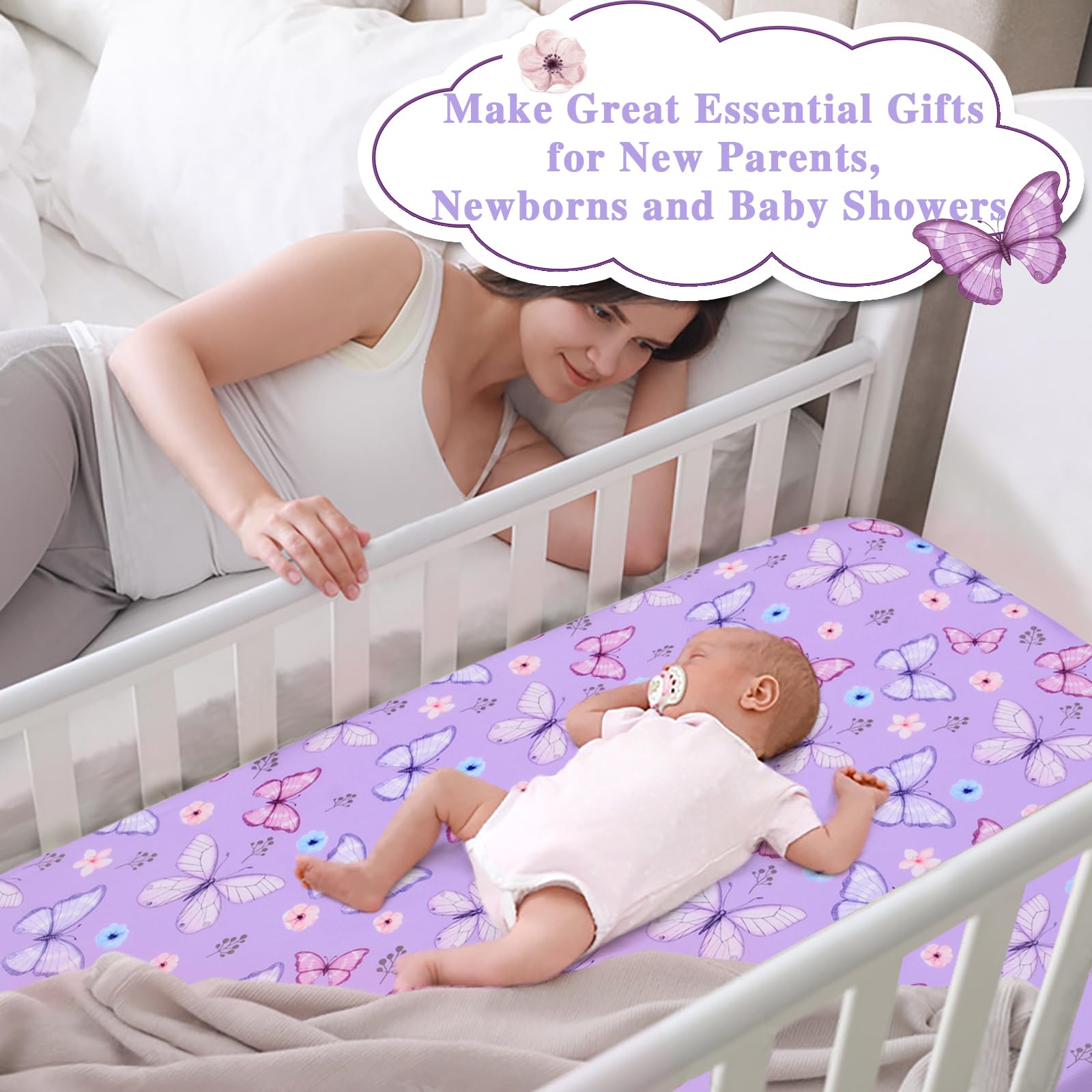 ใ€Easy Careใ€‘: Simply toss this purple butterfly crib sheet into the washing machine on gentle cycle and it'll be as good as new. Try to avoid sun exposure, can dry it on the reverse side. The high-quality fabric ensures that standard crib sheet retains its shape, color, and softness even after multiple washes, making it a practical and long-lasting investment.