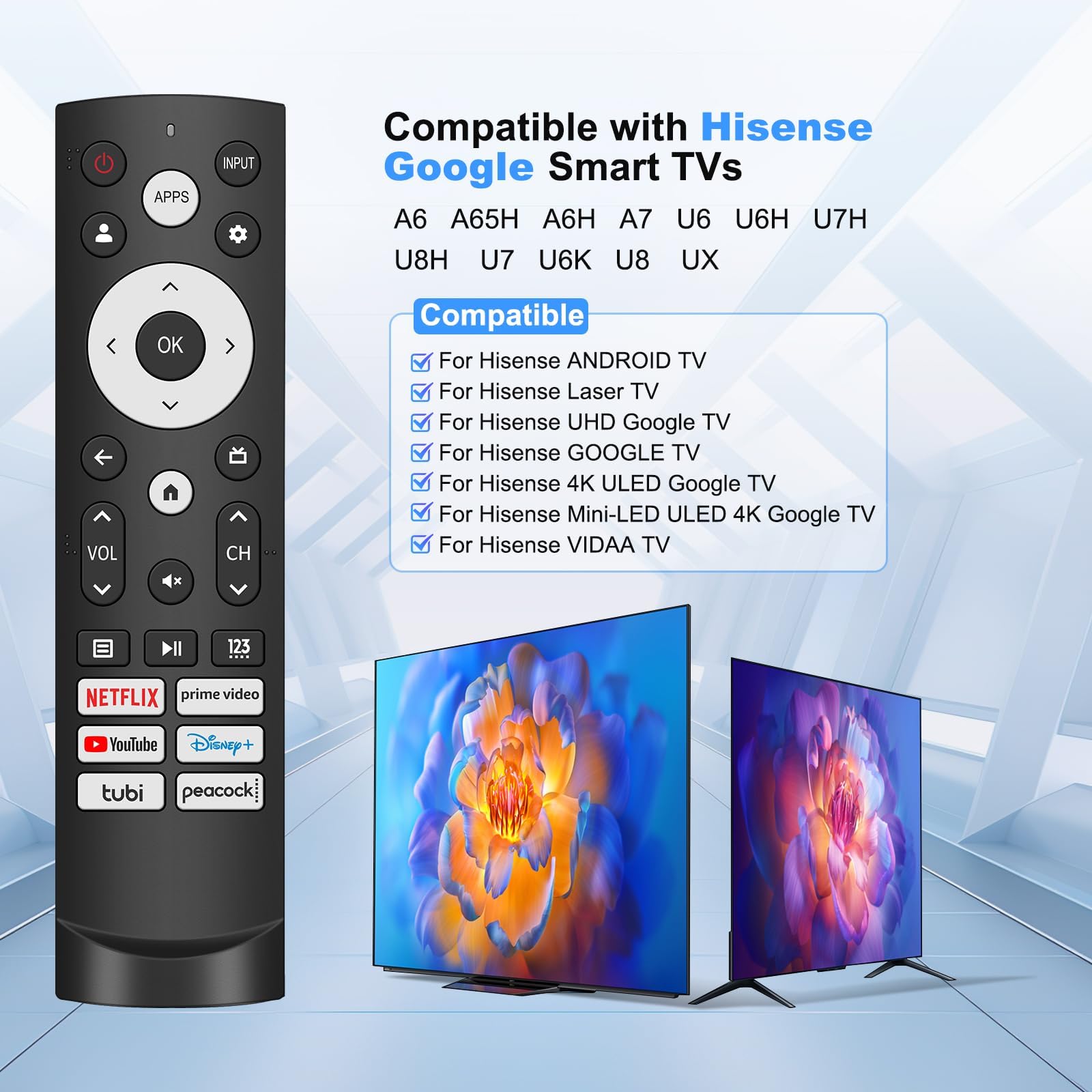 【Compatible TV Models】This Hisense Google tv remote replacement is suitable for 43A65K 50A65K 55A65K 43A65H 50A65H 55A65H 43A6H 65A6H 75A6H 55U6H 65U6H 75U6H 55U7H 75U8H 55U6K 65U7K 75U8K, etc(Not for Hisense Fire&Roku)