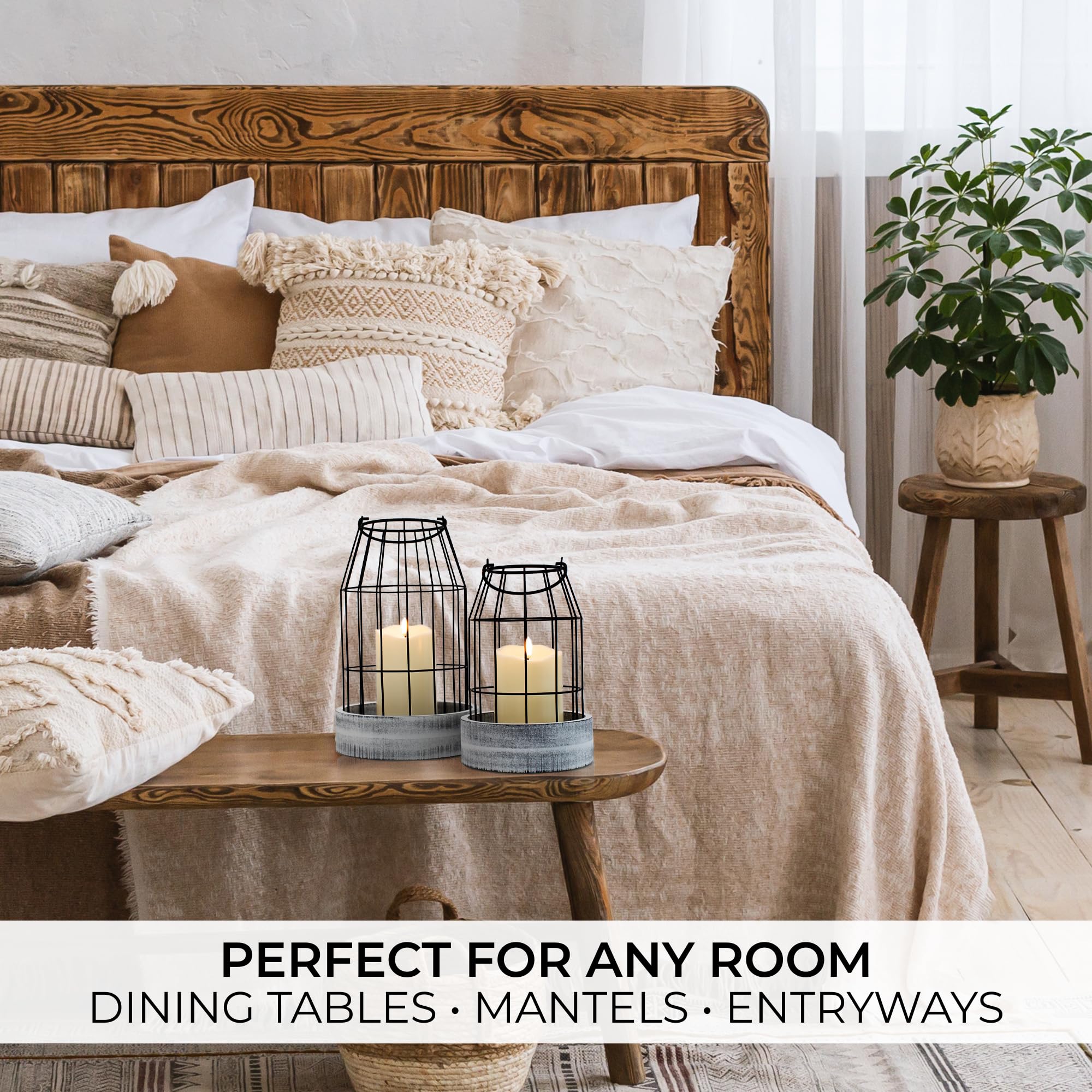 KIBAGA Farmhouse Lantern Set: Enhancing your home decor in an unique way! Freshen up your home decor with the cute lantern set by Kibaga. The rustic metal wire and white wooden stands in their modern distressed style bring home true farmhouse vibes. The lanterns come in a set of 2 - a small one and a bigger one - creating the perfect rustic decor duo for your living room, hallway, dining room & other areas around your home. The beautiful lanterns are a fantastic centerpiece for your dining table, fireplace mantle or in your hallway, but also make a special decorative highlight at a party or a wedding. It’s time to bring your decor to the next level! Your versatile home decor: You can always freshen up the lantern decor - whether you keep the lanterns without any additional decor elements or you add some other decorative items - it’s up to you! They look amazing with LED candles, fairy lights, faux ivy & lavender or other faux plants, flowers or even seasonal pieces for Christmas, Halloween and more. Please note: the lanterns are not (!) intended for use with real candles! It’s always a good time to surprise someone with a lovely gift! The lantern set makes a wonderful gift for a birthday, mother’s day, wedding or also for a housewarming party - what a great way to help someone to settle in & feel comfortable in their new home. Decorating your home like a pro with KIBAGA!