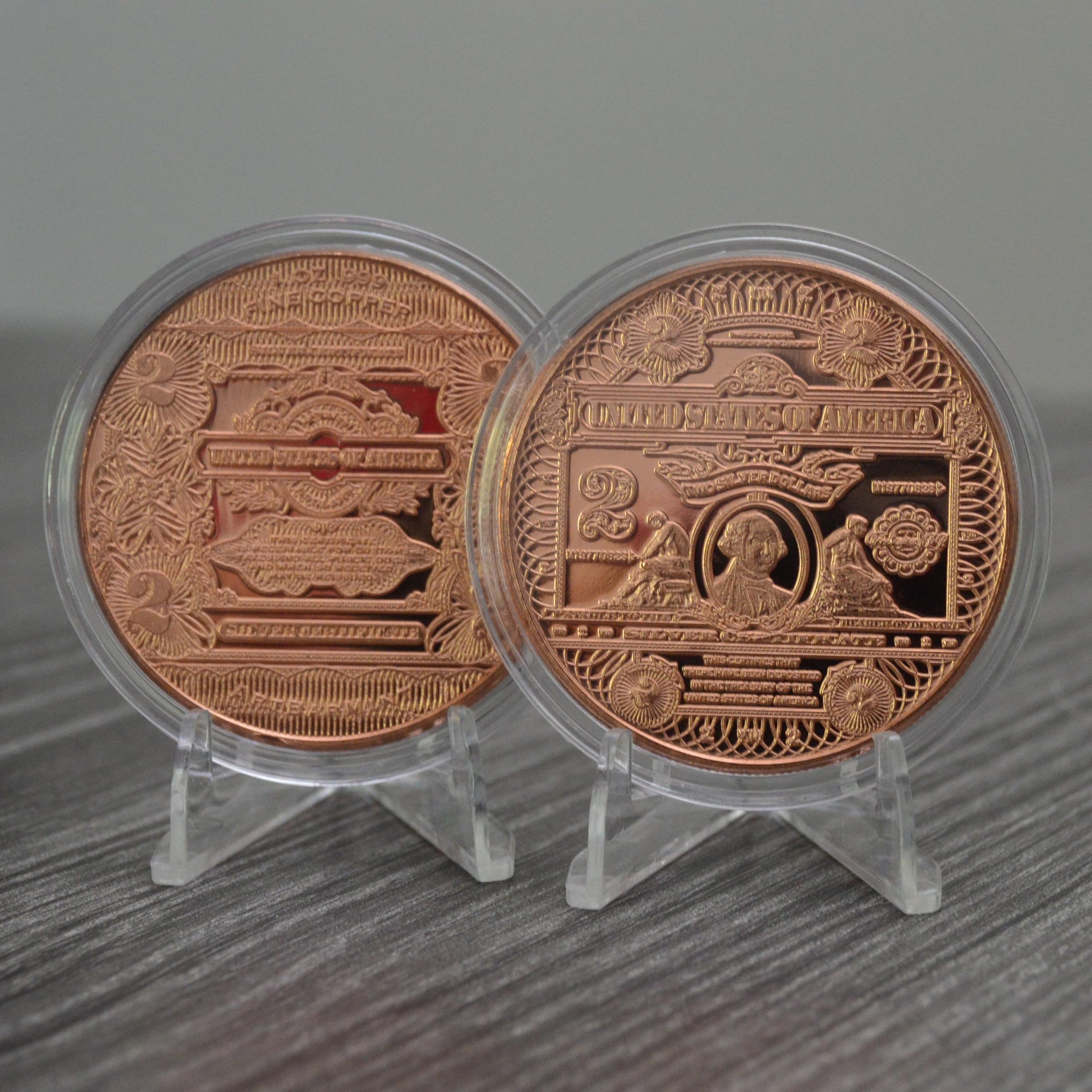 Experience a touch of American history with this $2 Washington Note Replica coin, minted from .999 pure copper. This piece reproduces the iconic design of the $2 bill, which holds an esteemed place in the U.S. currency timeline. The obverse of this coin showcases a detailed depiction of the portrait of President Thomas Jefferson, as found on the original $2 note. Jefferson, a Founding Father and the third President of the United States, is a symbol of American independence and ideals. Encased in a protective capsule, the intricate details of this coin are preserved, providing you with a lustrous keepsake that you can admire for years to come. Each coin is accompanied by a Certificate of Authenticity by Heavenly Metals, guaranteeing its 99.9% copper purity and origin. Whether you're an avid coin collector, a history enthusiast, or a patriotic American, this commemorative copper coin is a wonderful way to celebrate American heritage.