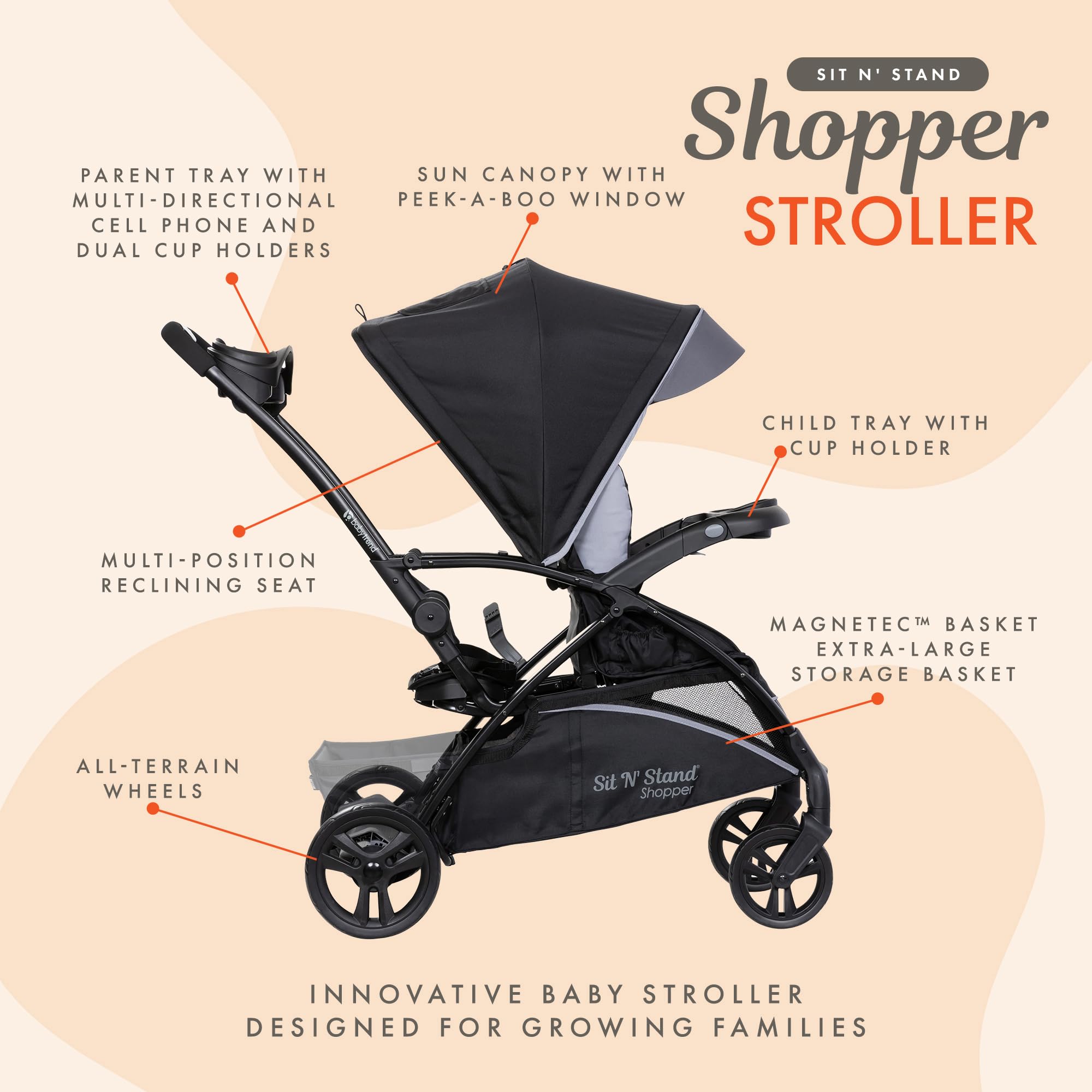 Multi-Use Baby Stroller: Baby stroller with a lightweight frame and streamlined design, ideal for growing families with 5 models to accommodate your family growing, including Car Seat N' Stand, Car Seat N' Shop, Sit N' Shop, Sit N' Sit, and Sit N' Stand
