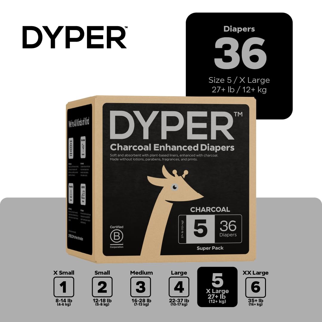 DYPER - Charcoal Enhanced Day & Overnight Disposable Baby Diapers - Made with Plant-Based* & Skin-Friendly Ingredients, Hypoallergenic for Sensitive Skin - Size 5, (36 Count)