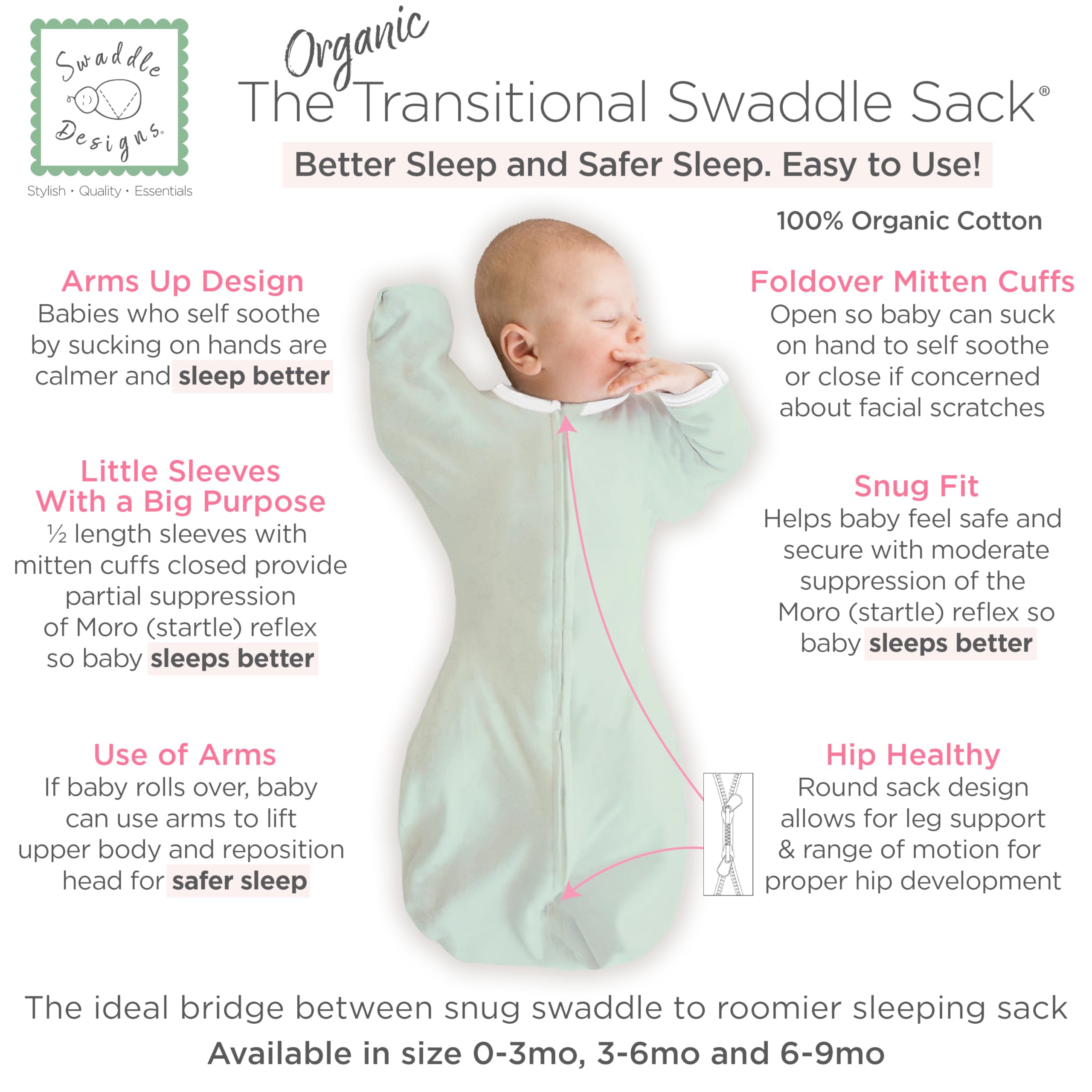 The Organic Transitional Swaddle Sack is the best & safest baby sleep sack when it is time to transition baby from a swaddle that restrains baby's arms. The TSS features an arms up sleeve design that allows baby to self-soothe. The patented arms up ½-length sleeves with foldover mitten cuffs closed provide gentle suppression of the Moro (Startle) Reflex to promote better sleep. The uniquely-shaped sleeve design is safer because if baby rolls over, the sleeves allow arm mobility so baby can use arms to reposition by lifting their torso and head to access air for safer sleep. The Transitional Swaddle Sack is ideal for babies who prefer to sleep with arms up, babies who are starting to or able to rollover, babies who like to suck on hands to self-soothe, and for babies who get out of a classic swaddle. Our special sleeves position baby’s arms close to their body in a flexed position and when mitten cuffs are closed, the sleeves provide gentle suppression of the Moro reflex, so baby sleeps better The foldover mitten cuffs may be worn open or closed; caregivers can open one or both cuffs, so baby can self-soothe by sucking directly on hand, or close the cuffs to protect baby from facial scratches. Helpful 2-way double-pull zipper with zipper guard to protect baby's skin; zips down from the top to make it easy to place baby in the sack and zips up from the bottom to make it easy to change baby’s diaper. 100% Organic Cotton GOTS Certified. Soft, stretchy, breathable fabric. 0.5 TOG for moderate temperatures. In cooler settings, parents can layer with a bodysuit underneath and/or sleeveless wearable blanket such as the SwaddleDesigns zzZipMe Sleeping Sack. Machine wash warm and tumble dry low. Recognized by the International Hip Dysplasia Institute (IDHI) as Hip Healthy. Designed by a nurse. US patents 11,812,795 & D833,613; EU, UK, CA, CN, and other countries online.
