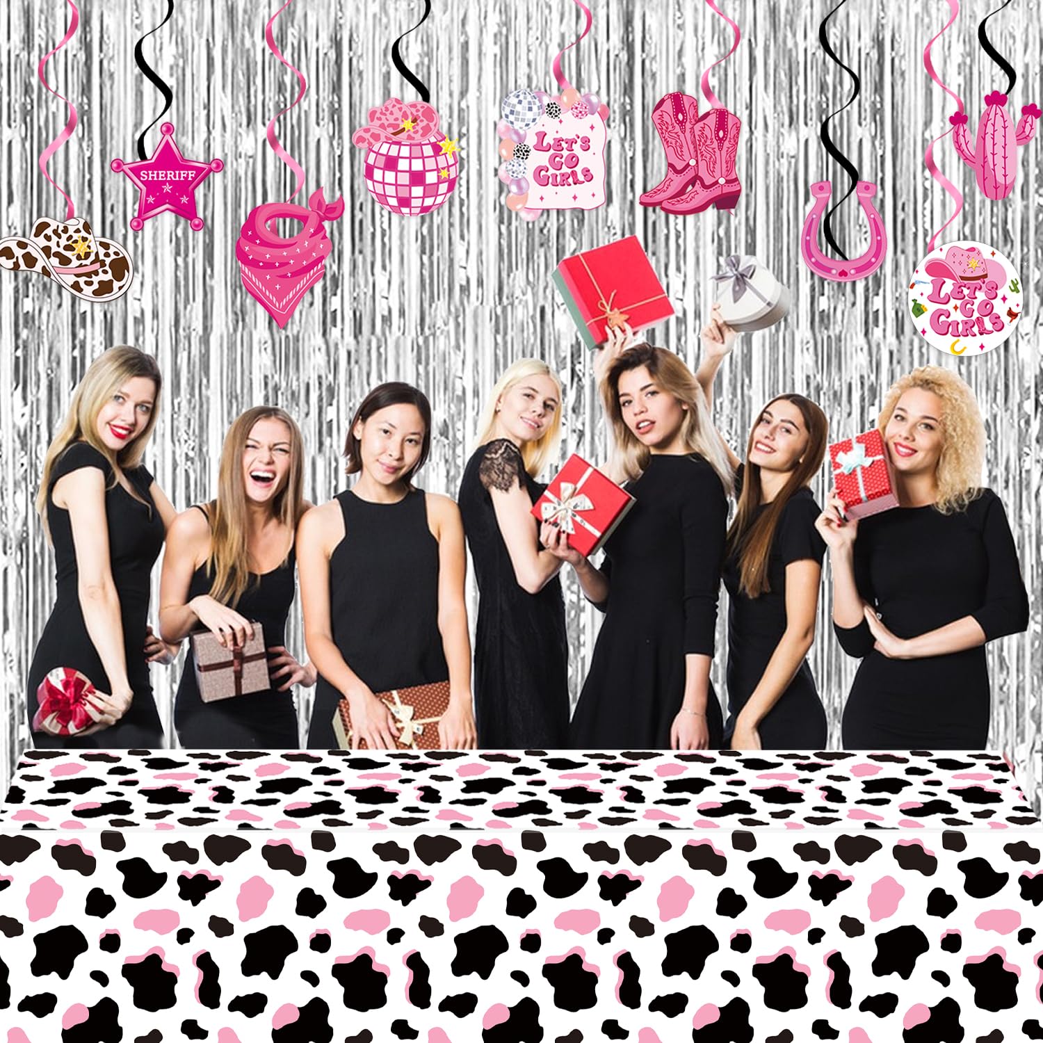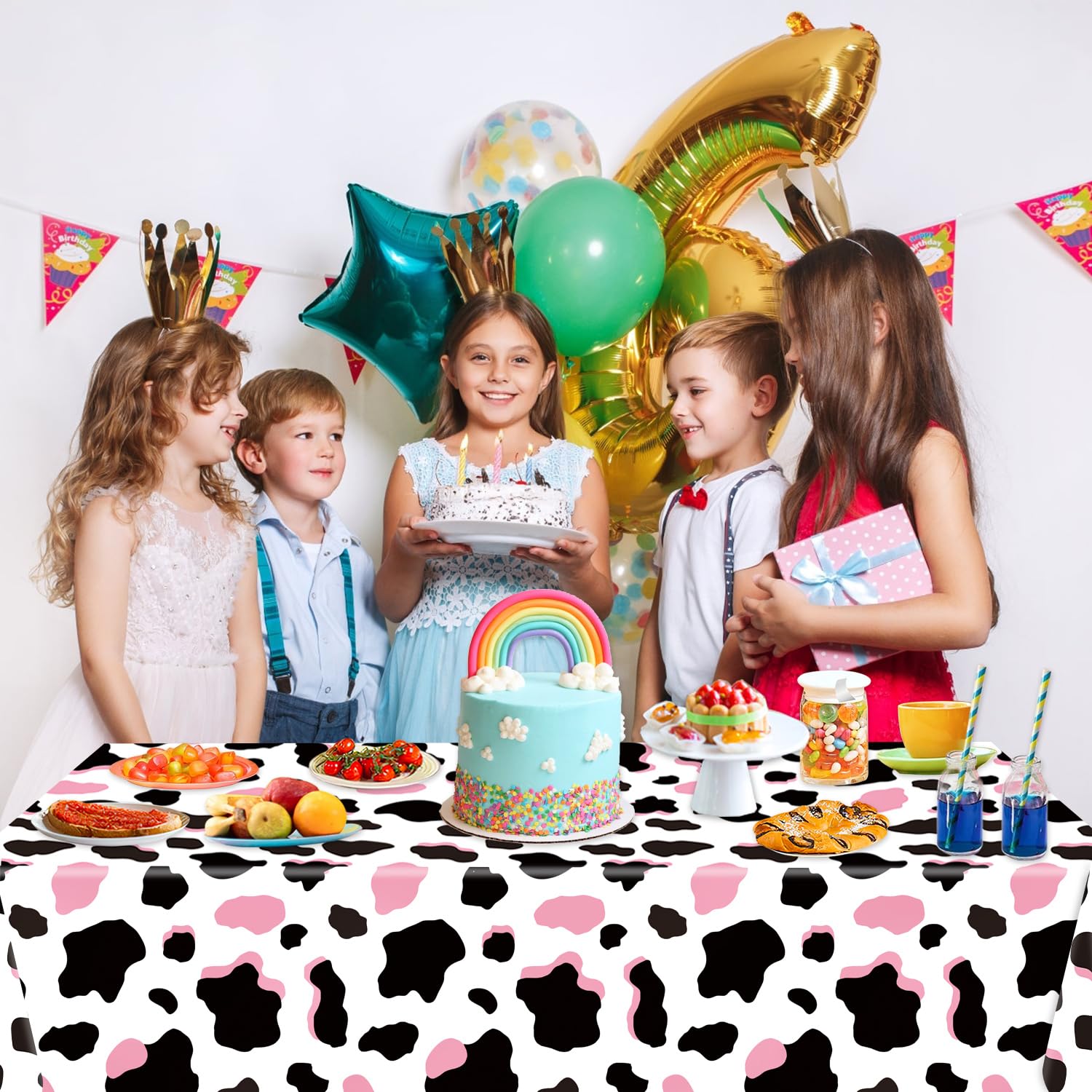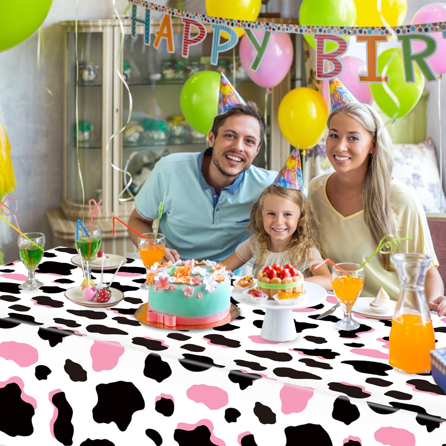 PINK COW PRINT DESIGN: This tablecloth features a pink, black, and white cow print design, perfect for creating a warm and memorable atmosphere for your cowgirl birthday party decorations