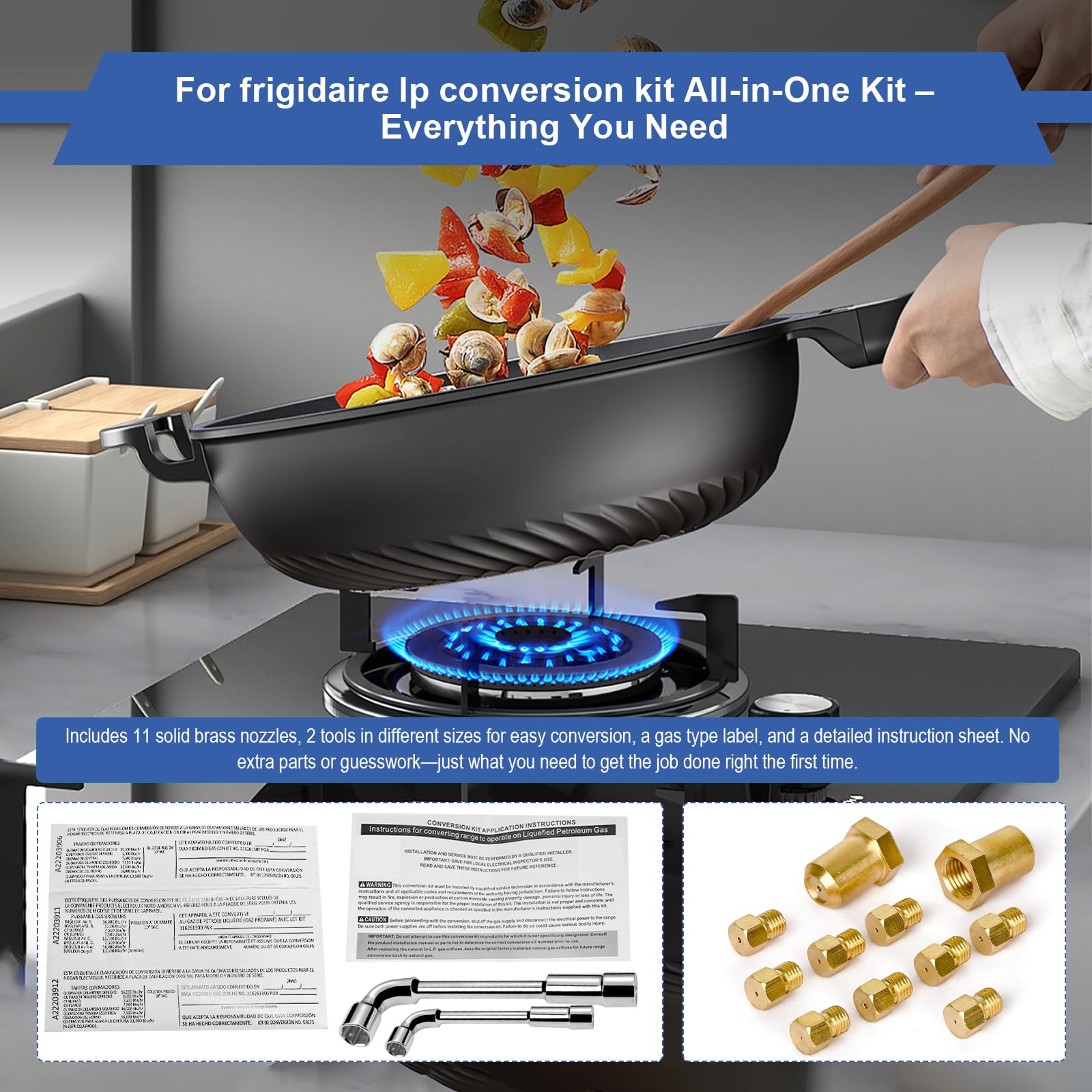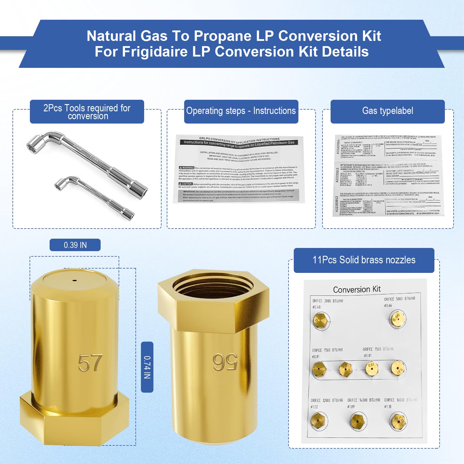 For Frigi-daire Lp Conversion Kit All-in-One Kit – Everything You Need: Includes 11 solid brass nozzles, 2 tools in different sizes for easy conversion, a gas type label, and a detailed instruction sheet. No extra parts or guesswork—just what you need to get the job done right the first time.