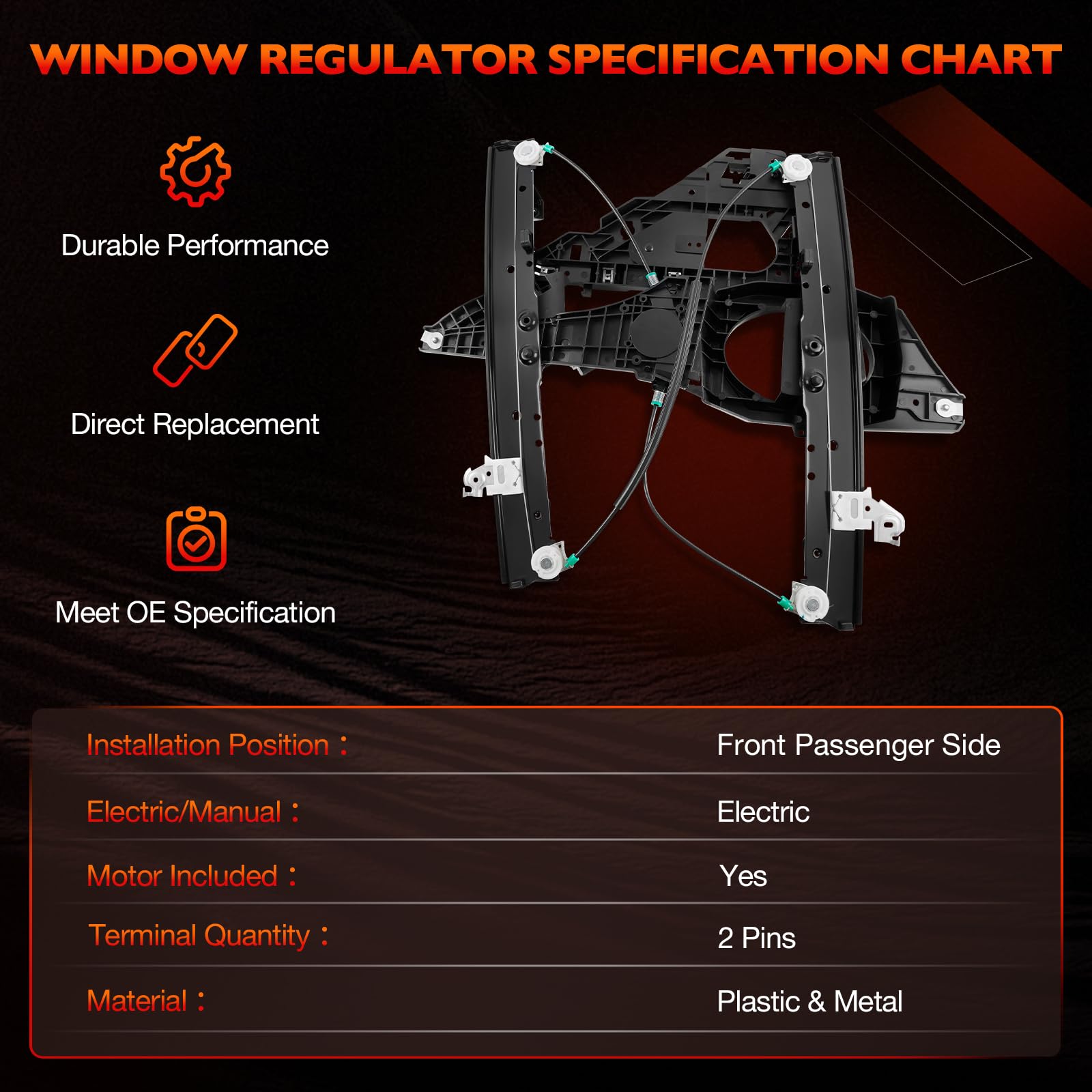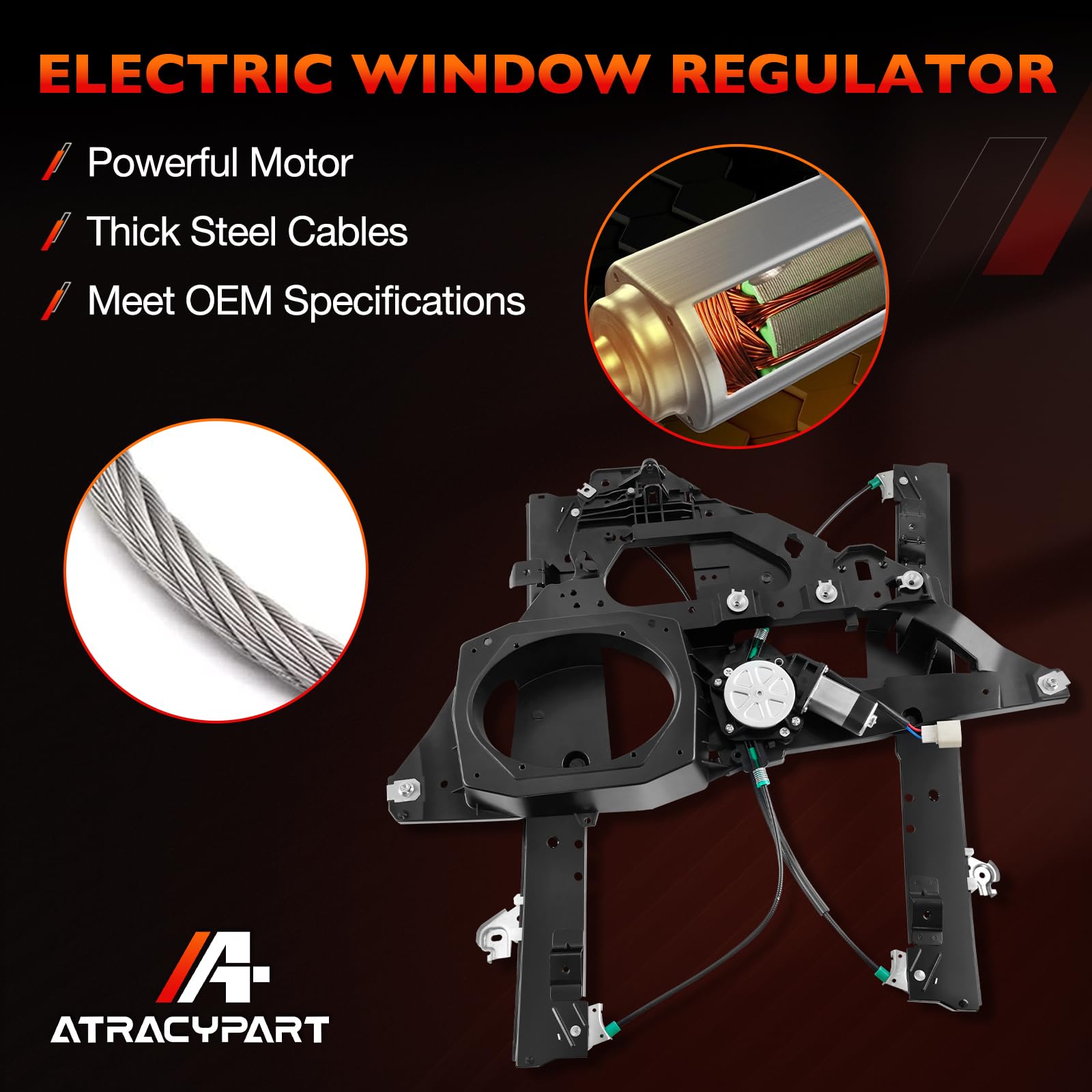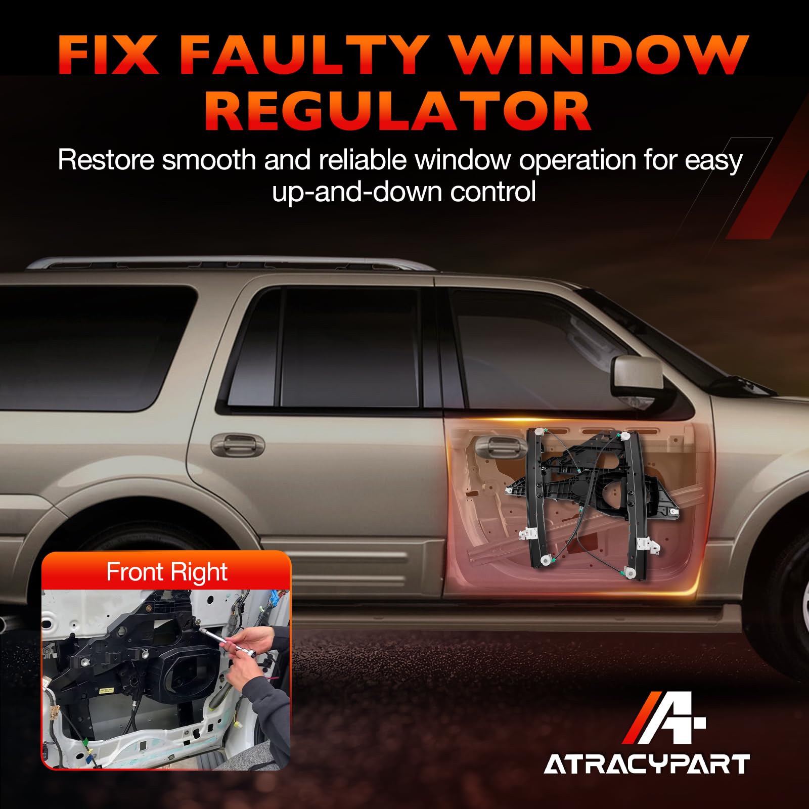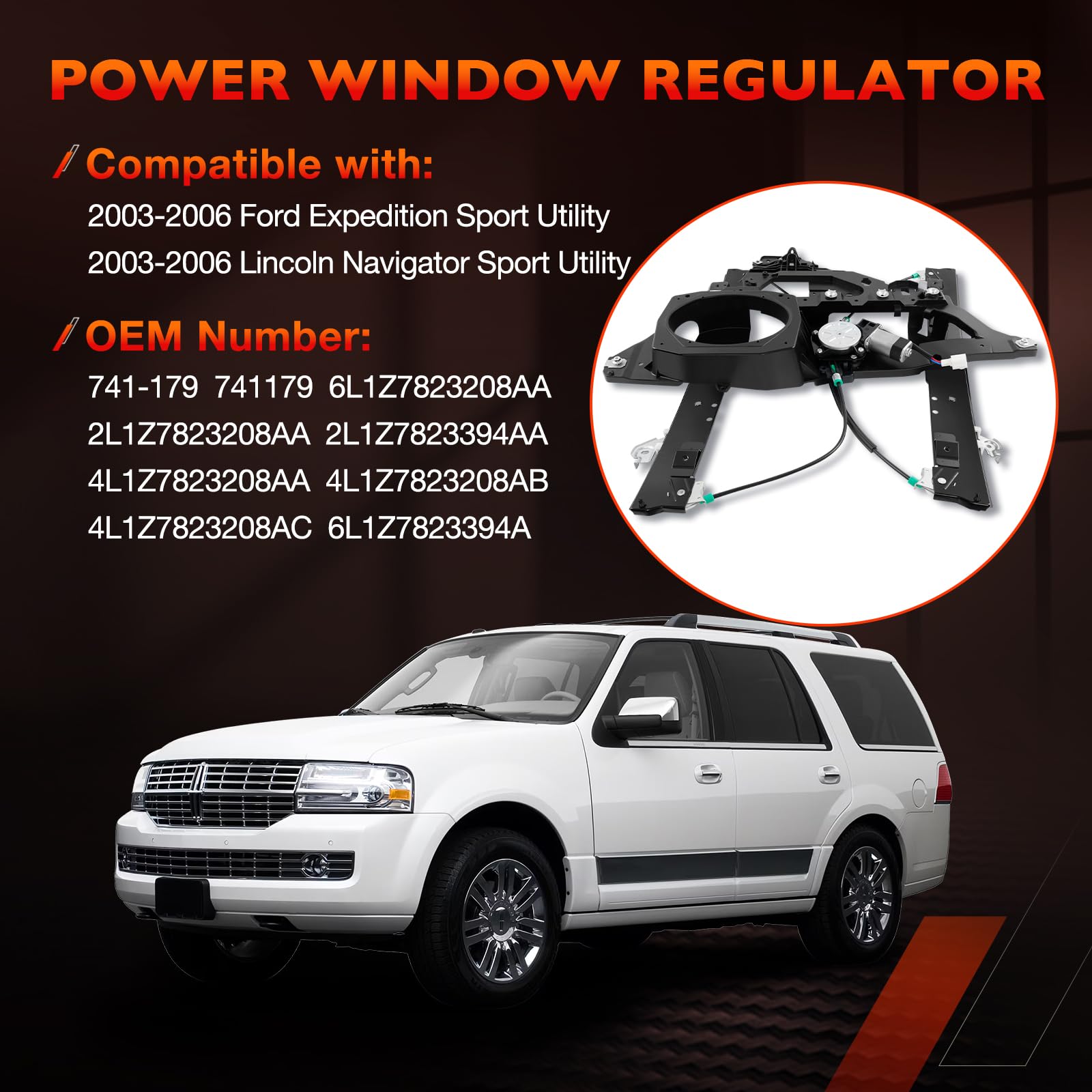Why Choose Us When your car window becomes slow, stuck, or fails to move, it can be frustrating and inconvenient. Our front passenger side power window regulator with motor assembly restores smooth, reliable operation, giving you the comfort, safety, and convenience you need. Built with durable materials and precise engineering, this electric window regulator ensures long-lasting performance and peace of mind. Key Features & Advantages Smooth & Reliable Operation: Our window regulator with motor provides consistent lifting power and quick response, allowing your windows to open and close effortlessly. Say goodbye to slow, stuck, or falling glass. Complete Replacement Assembly: This window regulator assembly comes with motor included, making installation simple and hassle-free. It is a direct replacement for worn or damaged units, restoring your vehicle’s original window performance. Durable Construction: Made with premium materials, this right side window regulator with motor resists wear and tear, reduces noise, and ensures stable, long-term performance for everyday use. Enhanced Safety & Comfort: The passenger side window regulator ensures your windows operate securely, preventing water leaks, wind drafts, and potential security risks. Enjoy safe and convenient window control anytime. Vehicle Fitment & Reference Number Compatible with Ford: Compatible with Ford Expedition 2003-2006 Special attention: fits 2-pin motor only, without anti-pinch function Compatible with Lincoln: Compatible with Lincoln Navigator 2003-2006 Sport Utility Special attention: fits 2-pin motor only, without anti-pinch function Reference Number / OEM Replacement: 741-179 6L1Z7823208AA Quality Guarantee: 12-Month Warranty