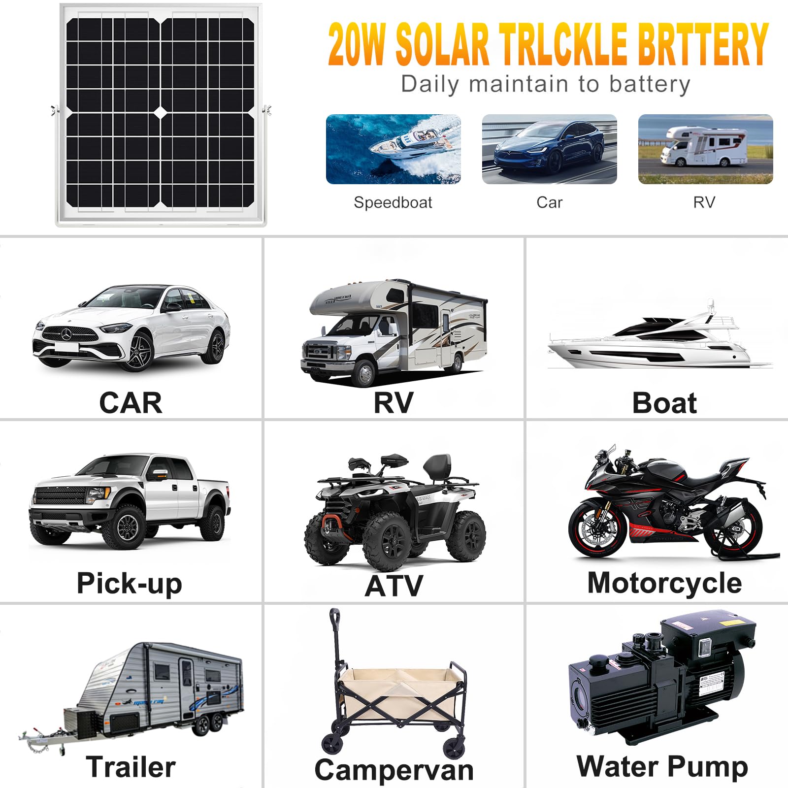 【High Conversion Rate】This 20W solar panel with monocrystalline A+ solar cell has an excellent cell efficiency of 21%-30%. Designed to charge and maintain 12V rechargeable batteries like LiFePO₄, Lithium Ion, AGM, SLA, GEL, EFB, MF, etc. Keep batteries in charged for trailer, tractor, truck, boat, motorcycle, RV, car, lawn mower, water pump, gate opener, electric fence, etc