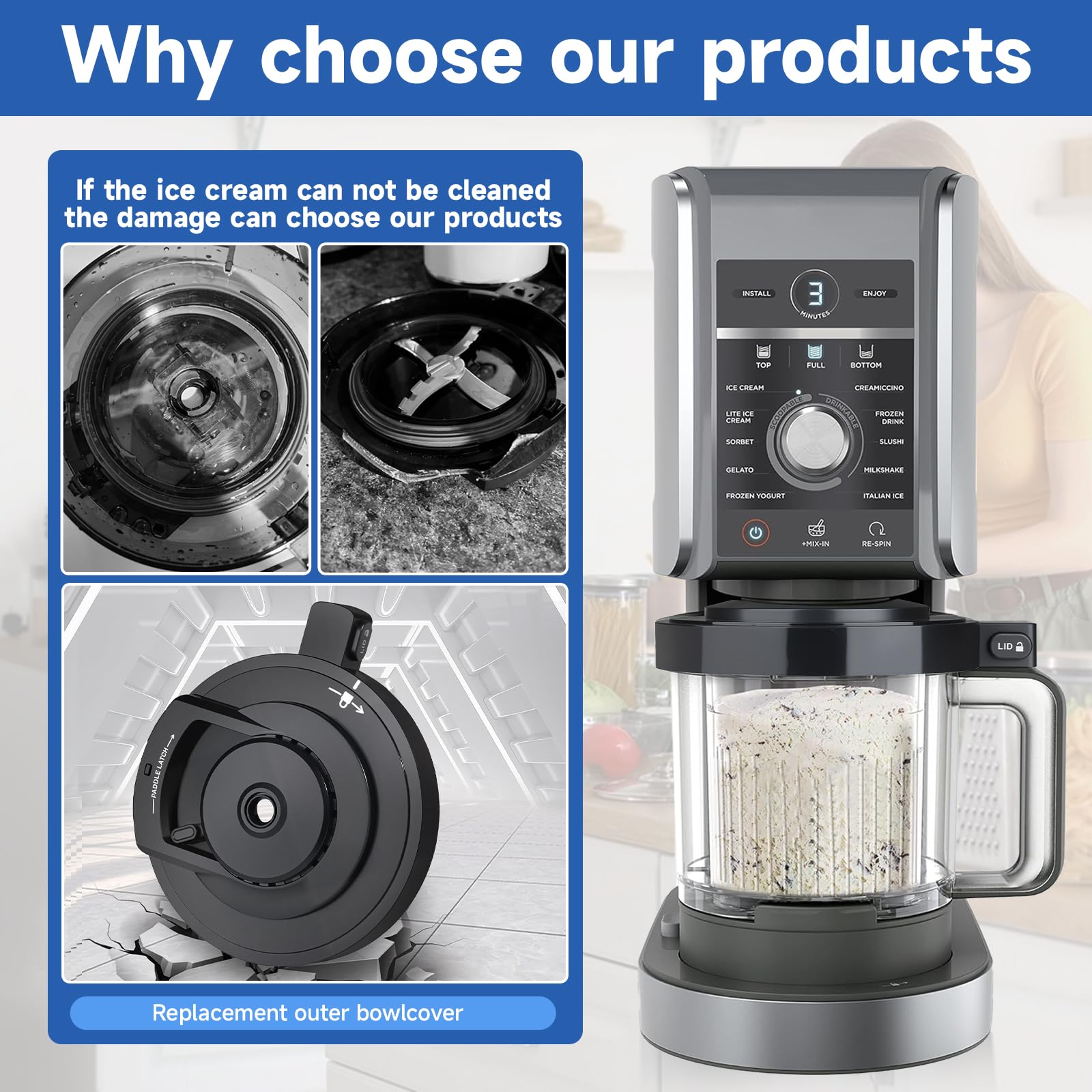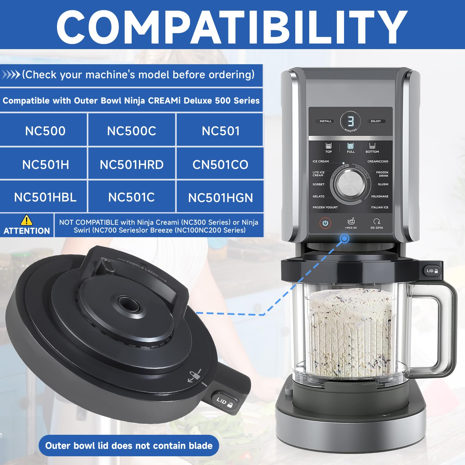 Perfect Compatibility: This replacement outer bowl cover is compatible with Ninja CREAMi Deluxe NC500, NC501, NC501H, NC501HBL, NC501HGN and CN501CO series ice cream maker.Please be sure to carefully check your machine model before purchasing.It will NOT fit the Ninja CREAMi NC299 & NC300 NC301 NC201 NC101 & Swirl (NC700 Series) Series Ice Cream Makers Series; please make sure you are purchasing for the correct unit.