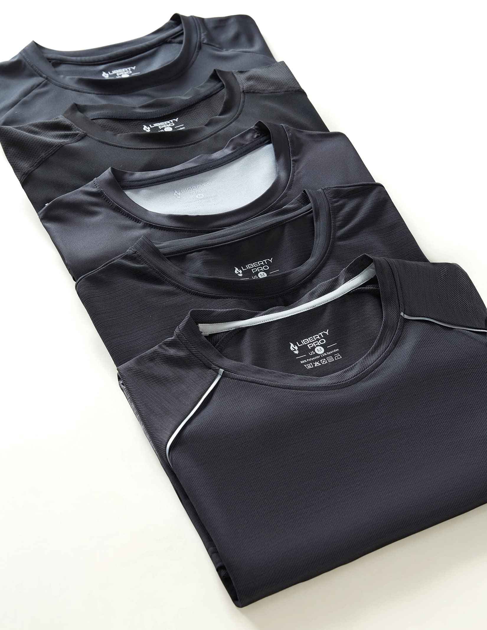 BULK UP YOUR WARDROBE: Our 5 Pack Men's Active Quick Dry Crew Neck T Shirts are a must-have for any man's wardrobe. With a variety of designs and patterns in classic black, these tees are perfect for workouts or everyday wear.