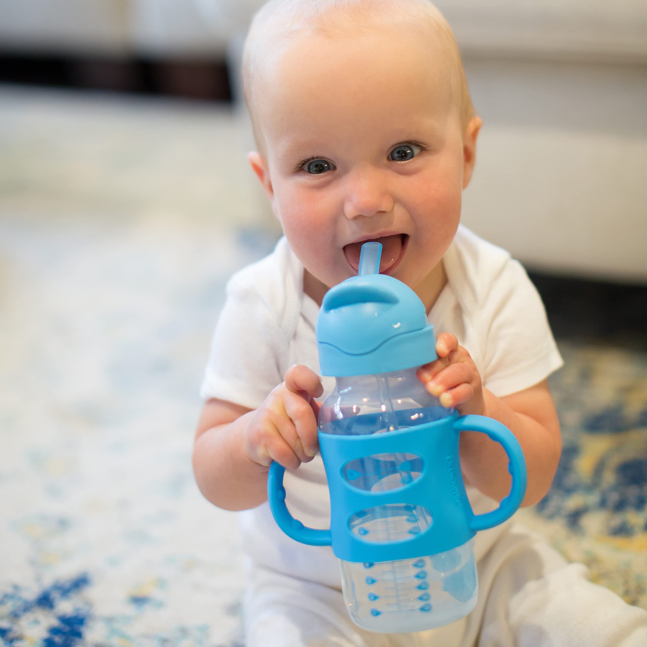 Dr. Brown's Milestones Sippy Straw Bottle is the easy way to help baby develop new drinking skills! Baby can continue to use the bottle they love while transitioning from bottle to big kid drinking. The soft silicone weighted straw moves to follow liquid inside the bottle, so baby can tilt and sip while transitioning from tipping the bottle upside-down to sipping upright. Soft yet sturdy silicone handles make gripping easy and help teach baby new motor skills. A spill-proof lid is travel-friendly and slides closed to keep the straw clean when not in use. Both the sippy straw lid and silicone handles fit Dr. Brown’s Options+ Wide-Neck 9 oz/270 mL baby bottles and sippy spout bottles. Straw cleaning brush included. Dishwasher (top rack) and sterilizer safe. BPA-free. 6m+.