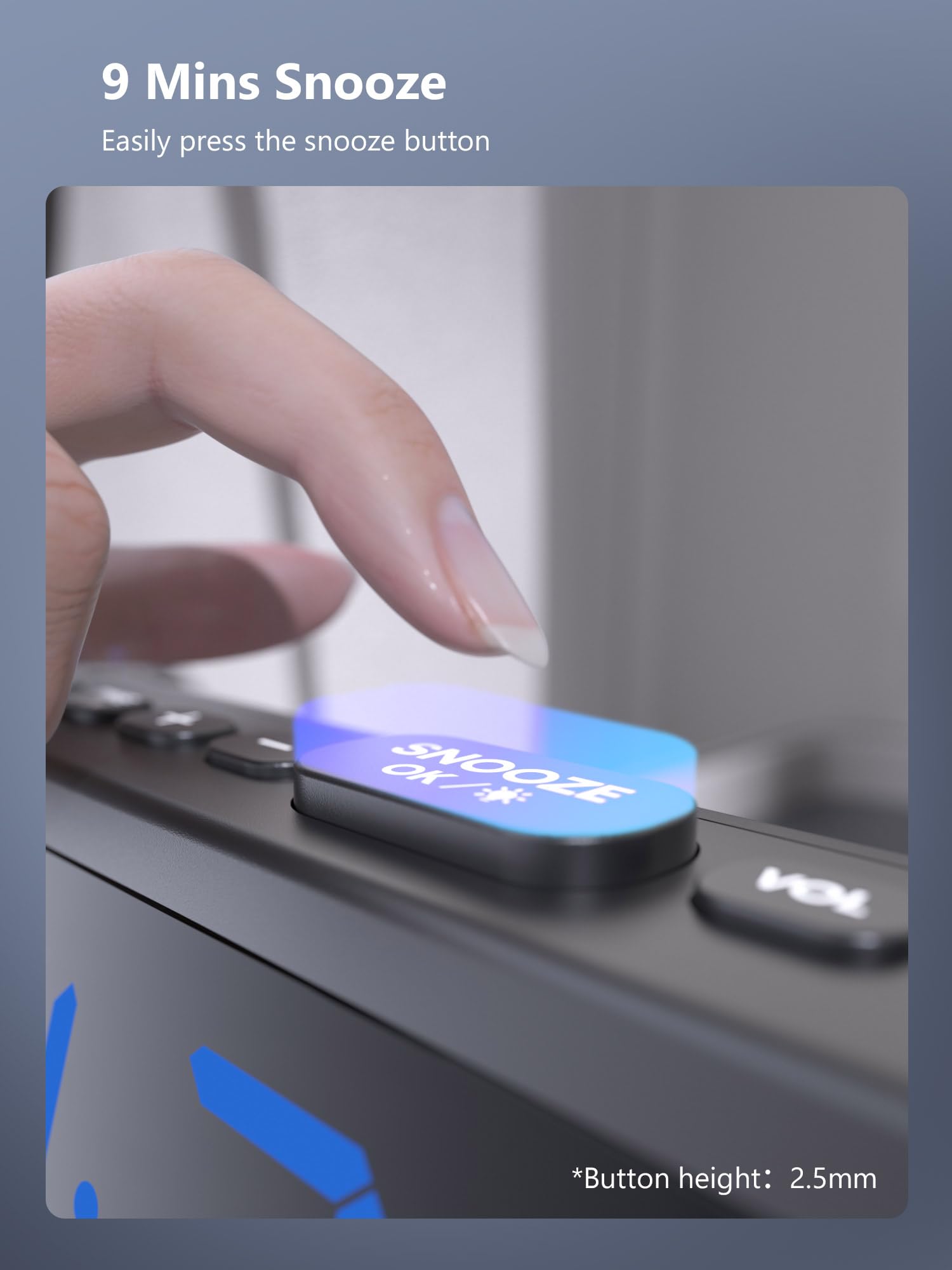 12/24 HOUR & DST TIME FORMAT & 9-MINUTE SNOOZE: Our clock for bedroom features a uniquely designed 12/24 Hour & DST button, allowing you to choose your preferred time format or activate DST time. Gain comprehensive knowledge of this clock projector by reading our detailed instructions within 1 minute. When the alarm goes off, press the large SNOOZE button on top to enjoy an additional 9 minutes of precious sleep before the next alarm cycle