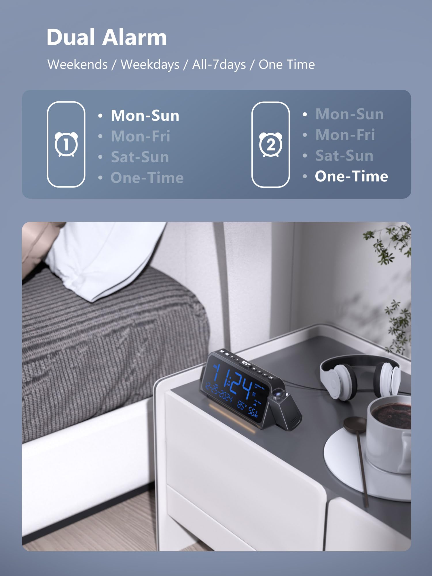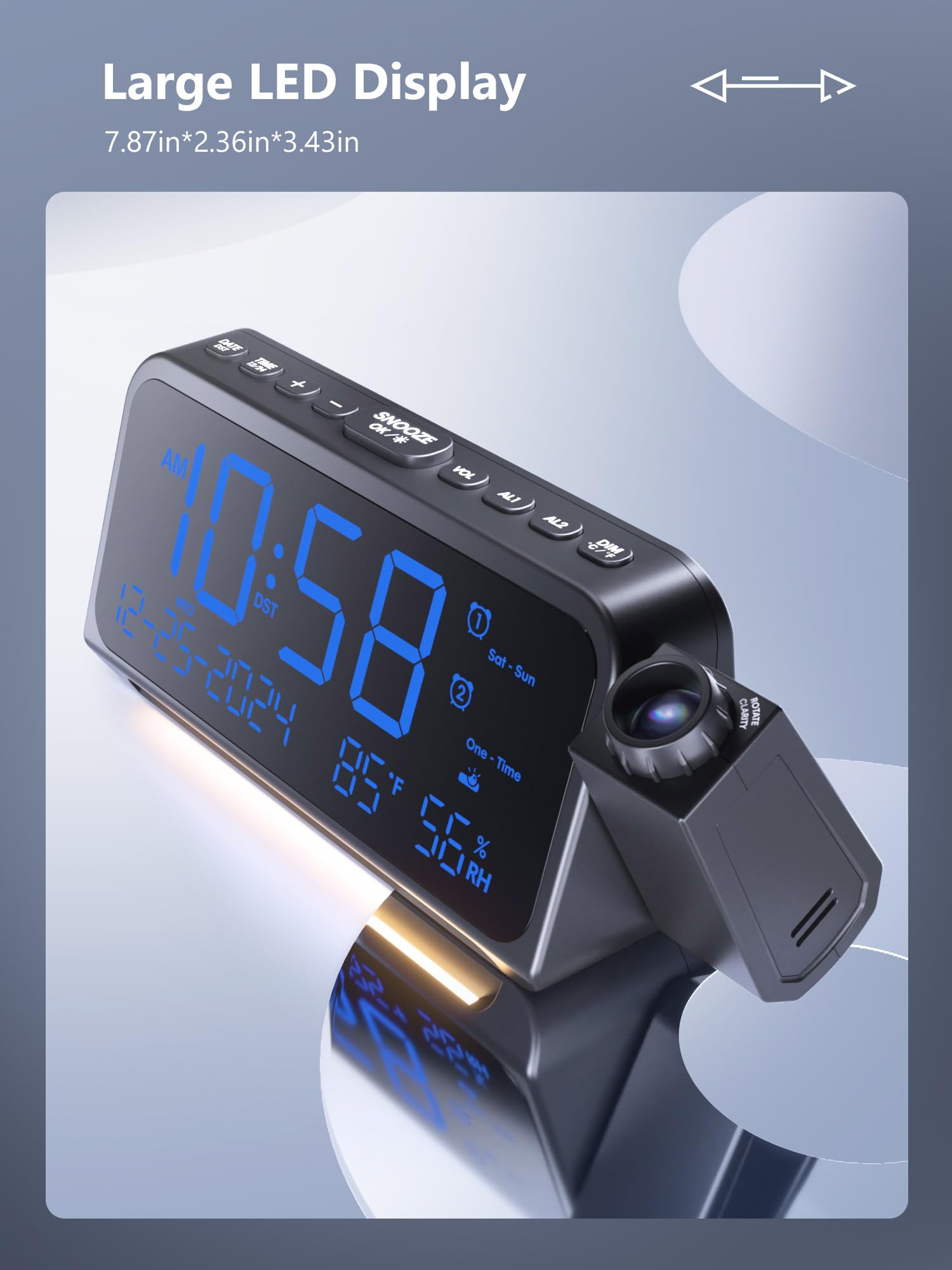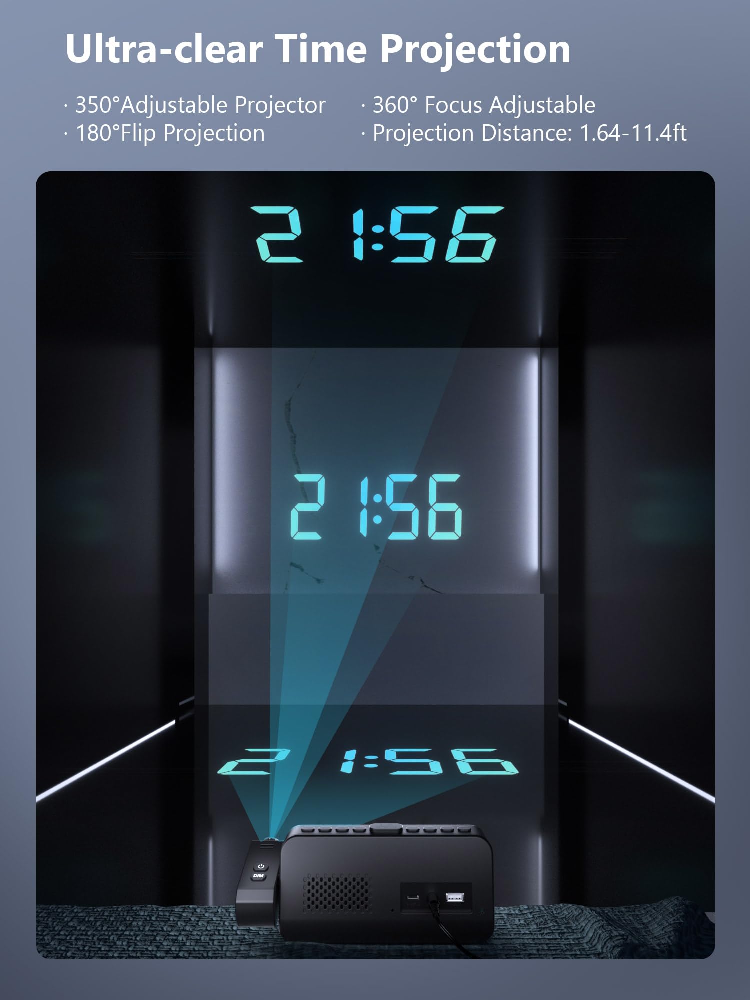 ULTRA-CLEAR ALARM CLOCK PROJECTION ON CEILING:This Projection Alarm Clock Provides a Crystal-clear Display of the Time on Your Ceiling or Wall. With an Upgraded Adjustable 350° Swivel Projector and a Rotating Focus Ring, It Ensures a Fine and Smooth Time Figure Image on the Wall or Ceiling at the Optimal Distance of 1.64-11.4ft (0.5-3 Meters). Easily Read the Time From Your Bed Without the Need to Touch Anything