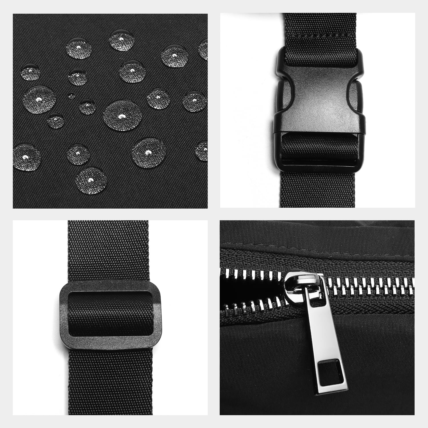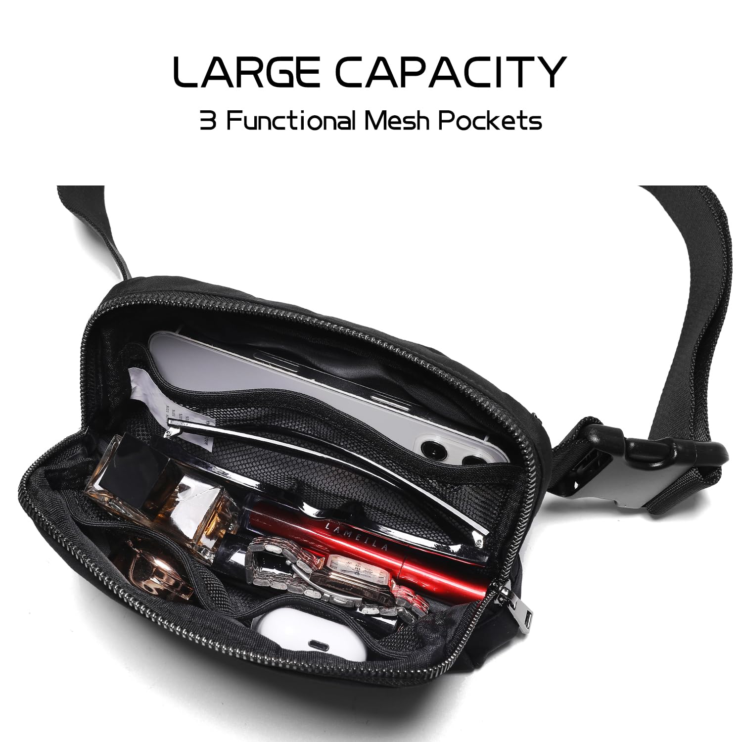 [Product Features]: The fanny pack is made of a skin-friendly clothing material (nylon). It is lightweight, easy to clean and water resistant. it features sturdy double zip pockets and adjustable straps, as well as three mesh pockets to store items that are prone to scratching, such as mobile phones and watches etc.