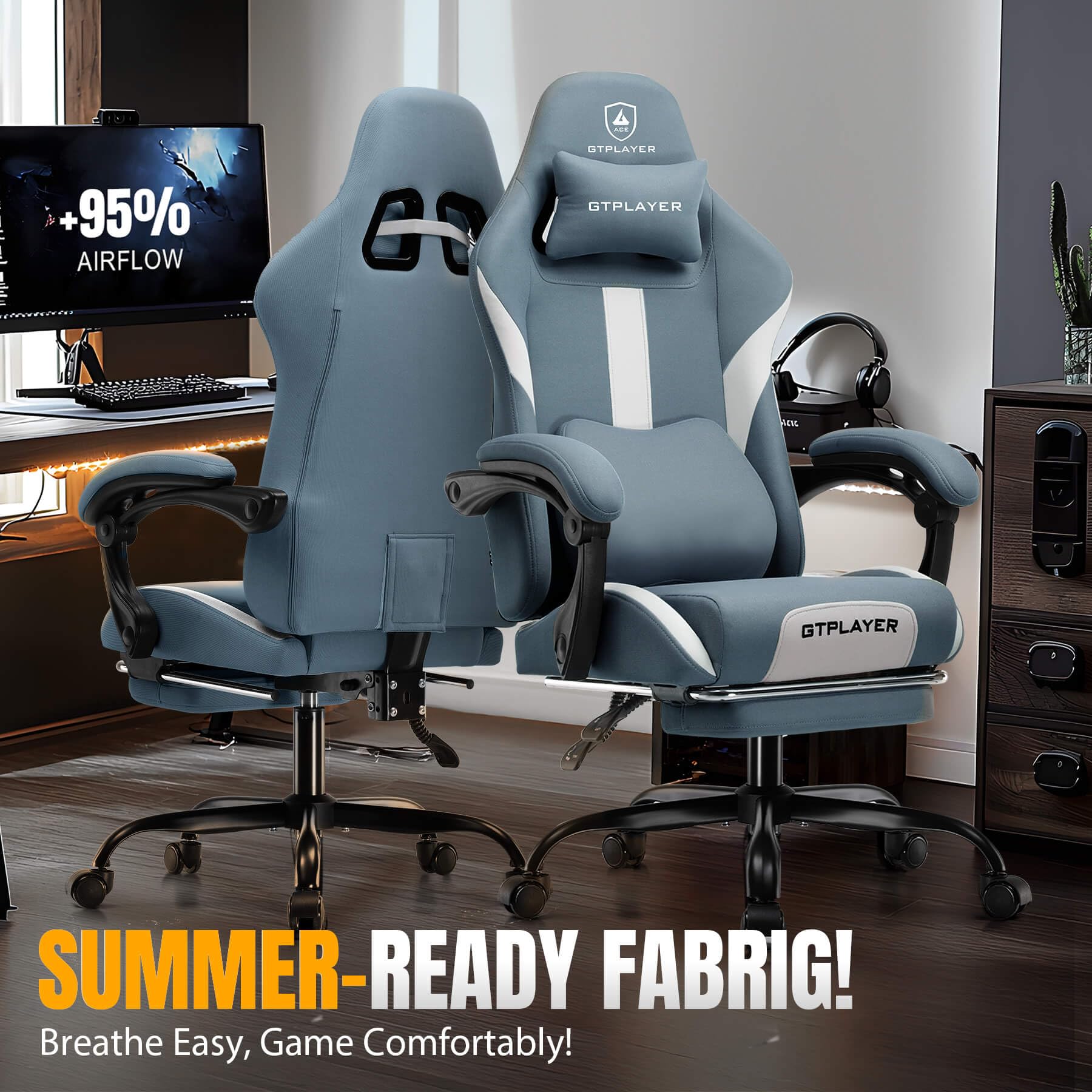 【Ergonomic Excellence for Long Sessions】Professionally engineered for all-day comfort. Features adjustable lumbar support, cushion-linked armrests, and a reclining backrest (up to 135°) with retractable footrest. GTPLAYER computer chair promotes healthy posture and targets pressure points, ensuring unwavering support during marathon gaming or work