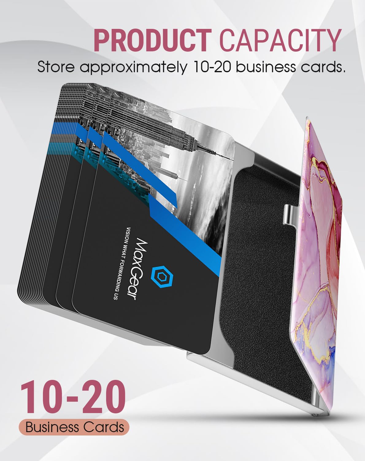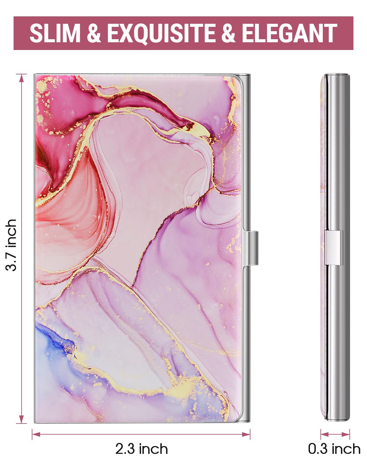 Store approximately 10-20 business cards, also suitable for ID cards, credit cards, gift cards, and more. This business card case is made of premium stainless steel. Business card box with scratch-resistant interior lining provides more protection to your cards. Size: 3.7"L x 2.3"W x 0.3"H